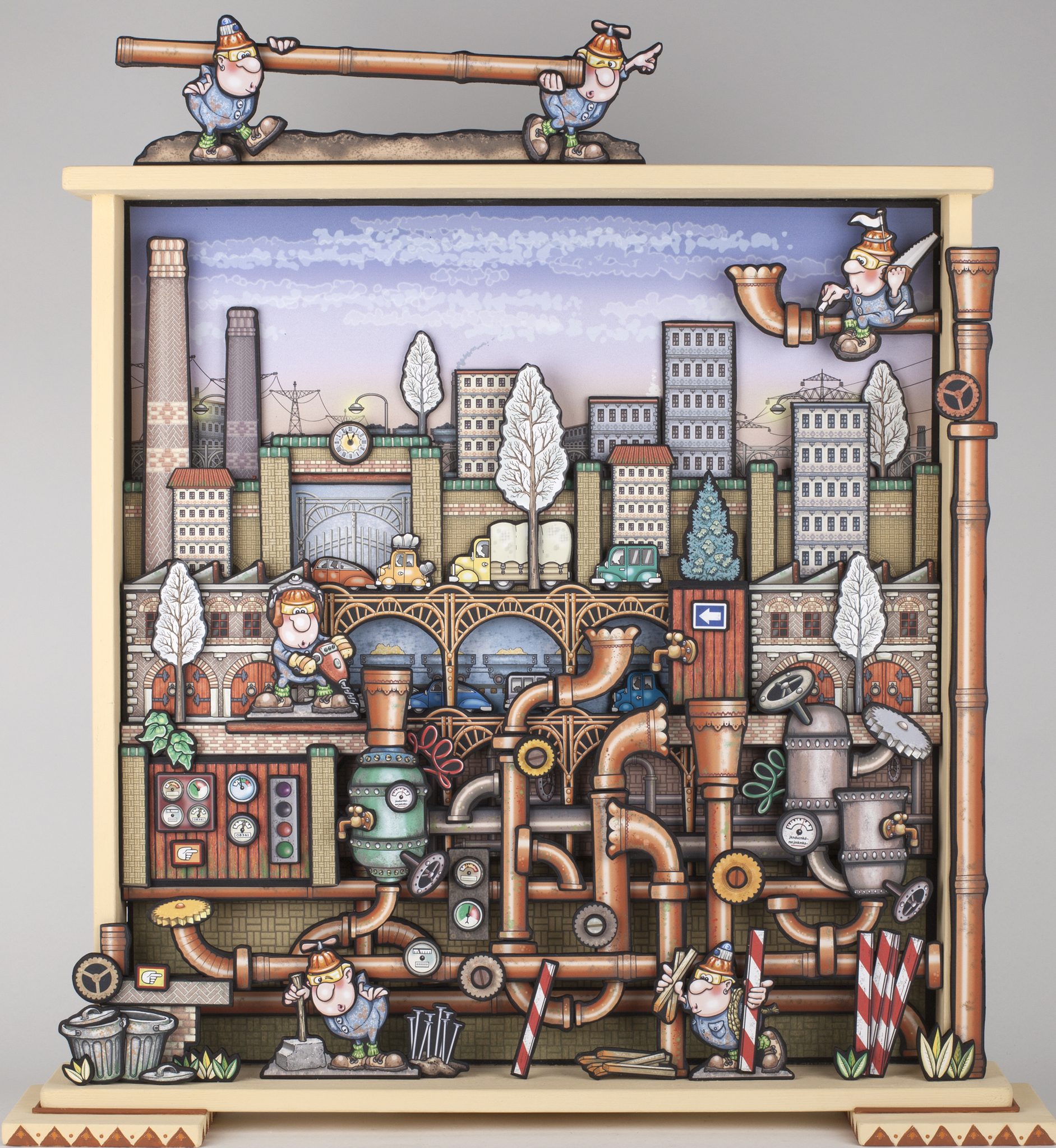 Het liefst maak ik verhalende tekeningen met wat humor, geplaatst in drie-dimensionale houten kistjes. Maar ook beeldhouwwerk, keramiek en textiel. Altijd figuratief met veel details.