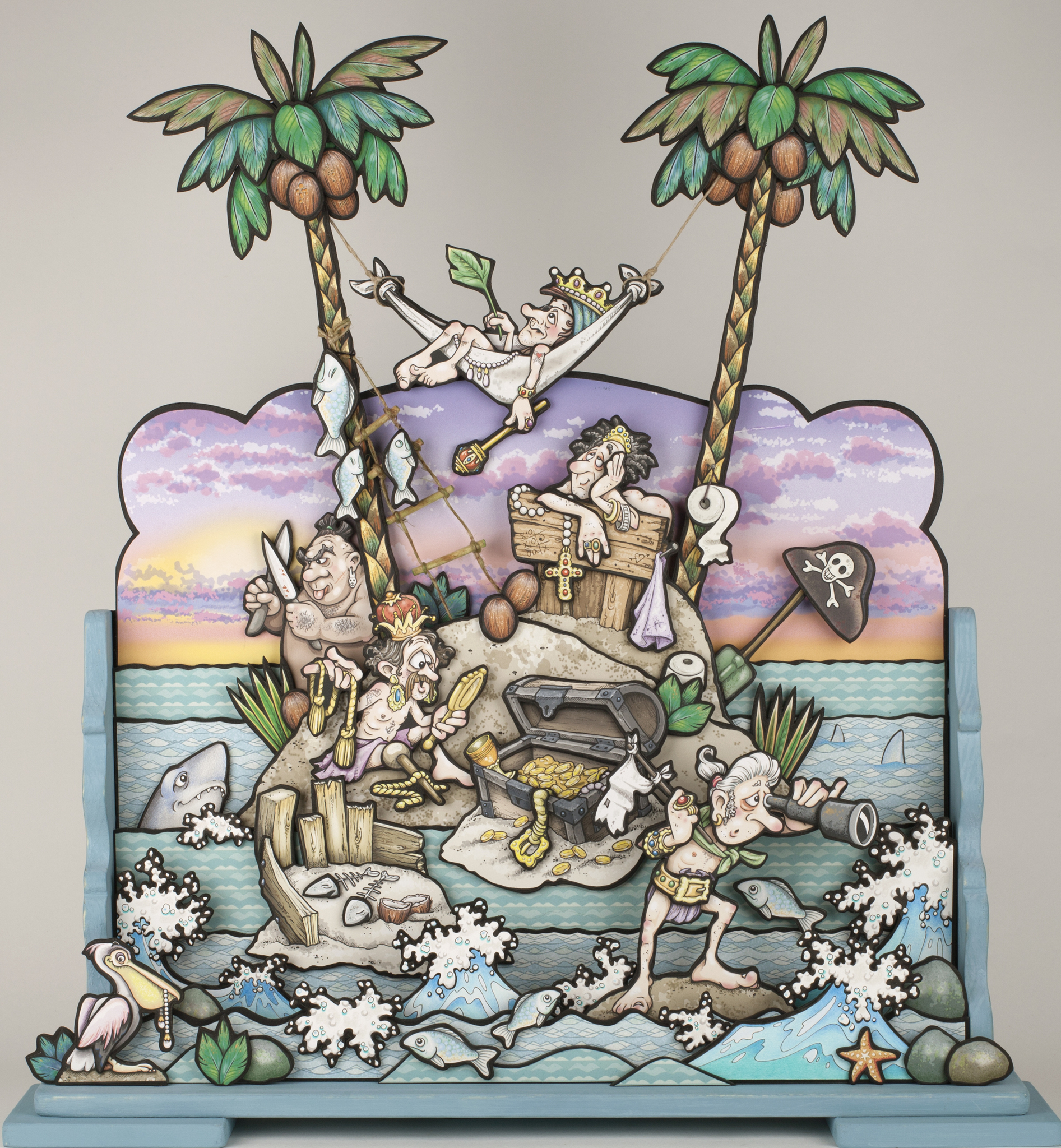 Er is in de piraterij een heus fortuin te winnen, maar oog in oog met een orkaan valt er niets te beginnen...? Het schip liep vol, de mast die brak, het kreunde en piepte, en na de laatste grote golf verdween het in de diepte... Een handvol rovers kon met buit nog net wat land bereiken, maar 't is wat krap zo'n hoopje zand, als maanden gaan verstrijken....