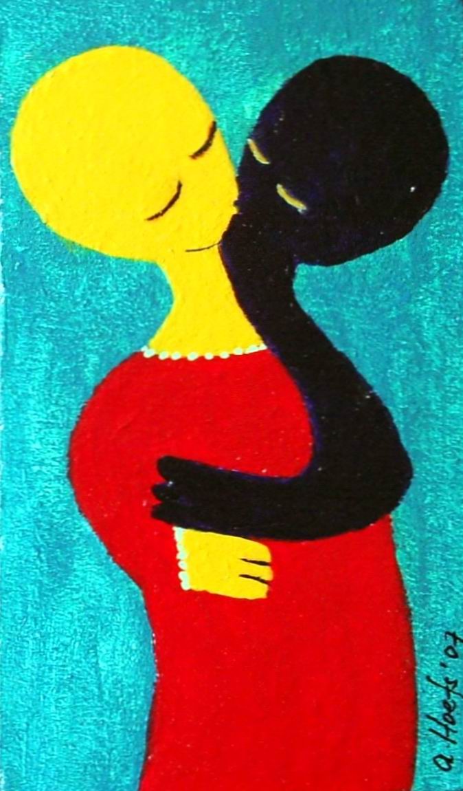 Tweeluikje met in verwachting-2. Liefdevolle omarming; blijdschap over de komst van een kind. Gemaakt in opdracht om cadeau te geven aan stel dat een kind verwacht