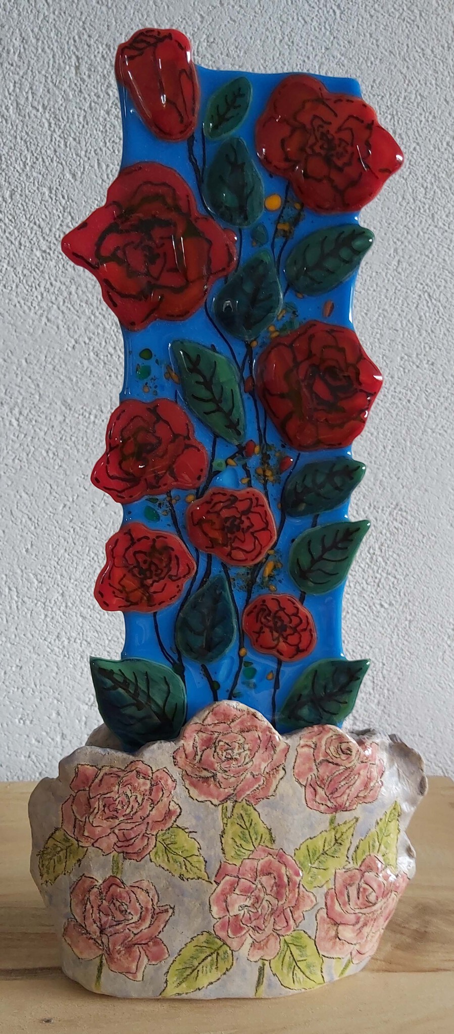 Rode rozen van glas, kermiek gedecoreerd met rode rozen. Het werk is verkocht, maar op aanvraag maak een nieuw vergelijkbaar werkstuk.