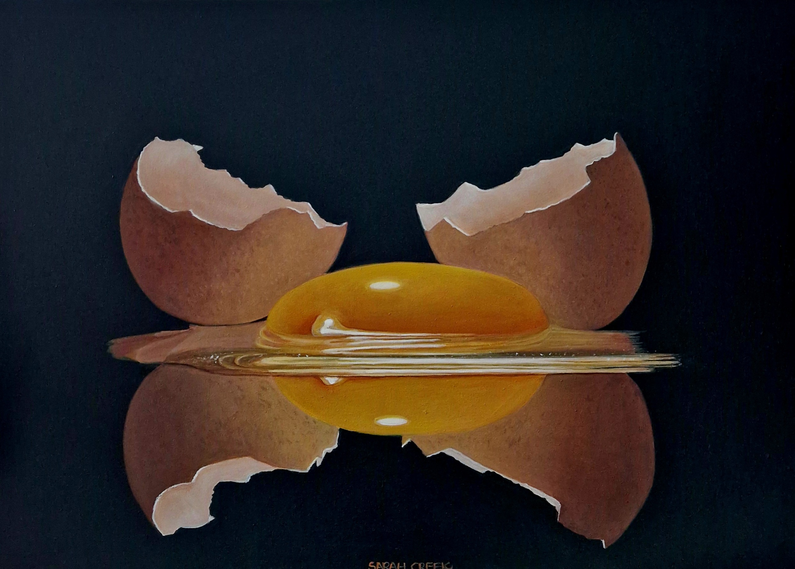 Gebroken ei op glasplaat. Met zwarte baklijst.