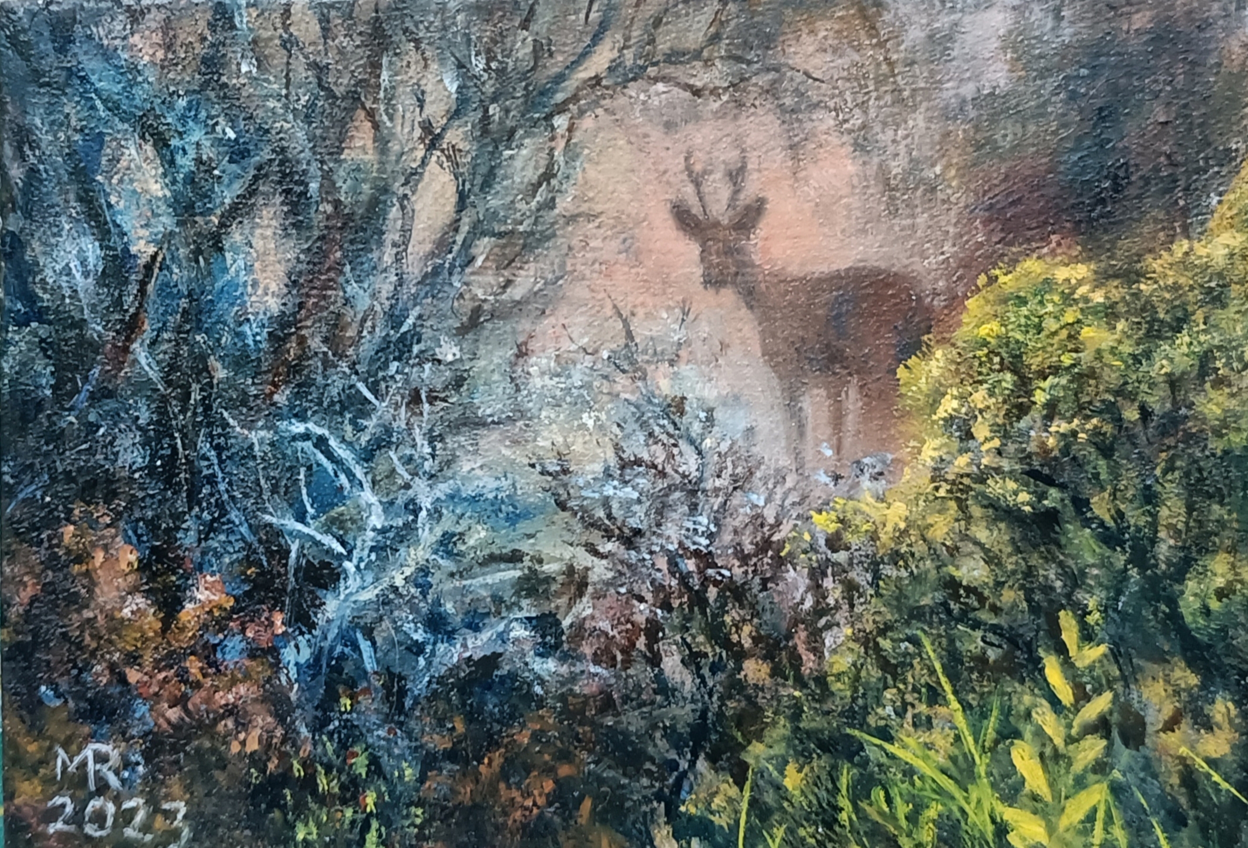 Uit de serie “Droomlandschapjes”: Een fantasie schilderijtje(olieverf/paneel), ontstaan uit een abstract vlekkenpatroon waarbij het voor mij ook altijd een verrassing is wat eruit komt. Inclusief de lijst zijn de maten 16,5 x 21 cm.