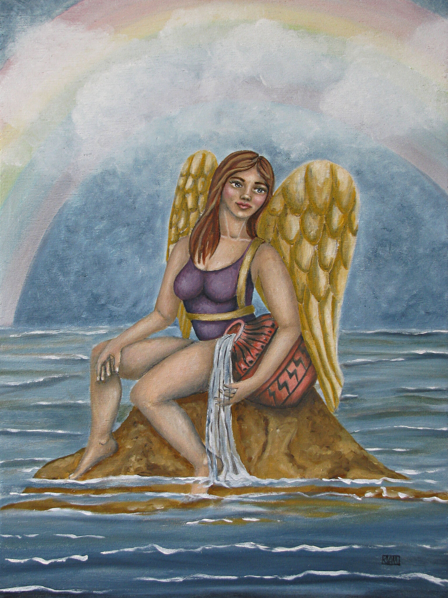 Zij die met de Goden spreekt ... Iris is in de Griekse mythologie de Godin van de regenboog, de brug tussen hemel en aarde. Het schilderij werd geinspireerd op het beeld 'middagzon'