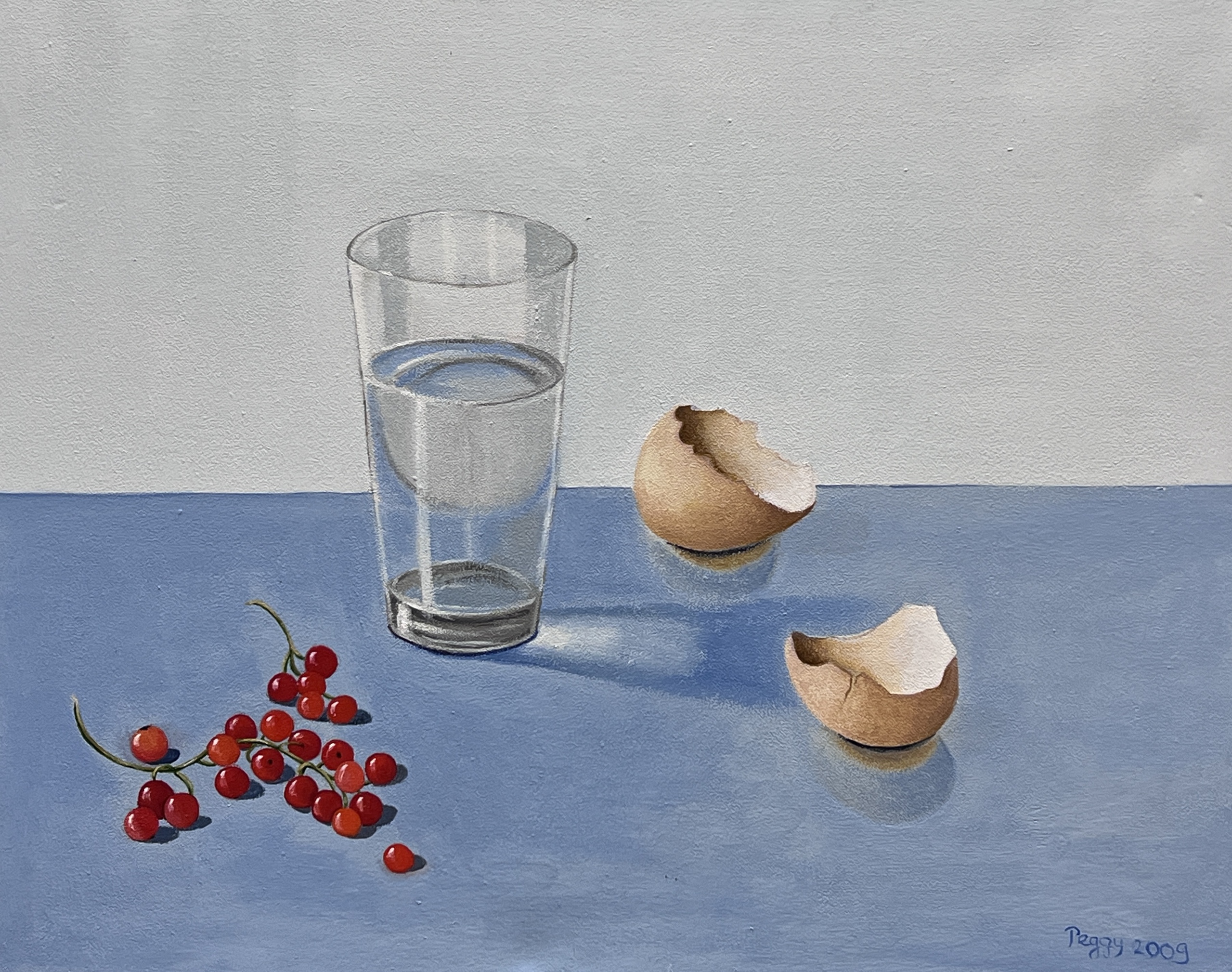 Glazen glas met eierschalen en rode besjes. Olieverfschilderij Hoog 40 cm x breed 50 cm x diep 4 cm. ophangsysteem