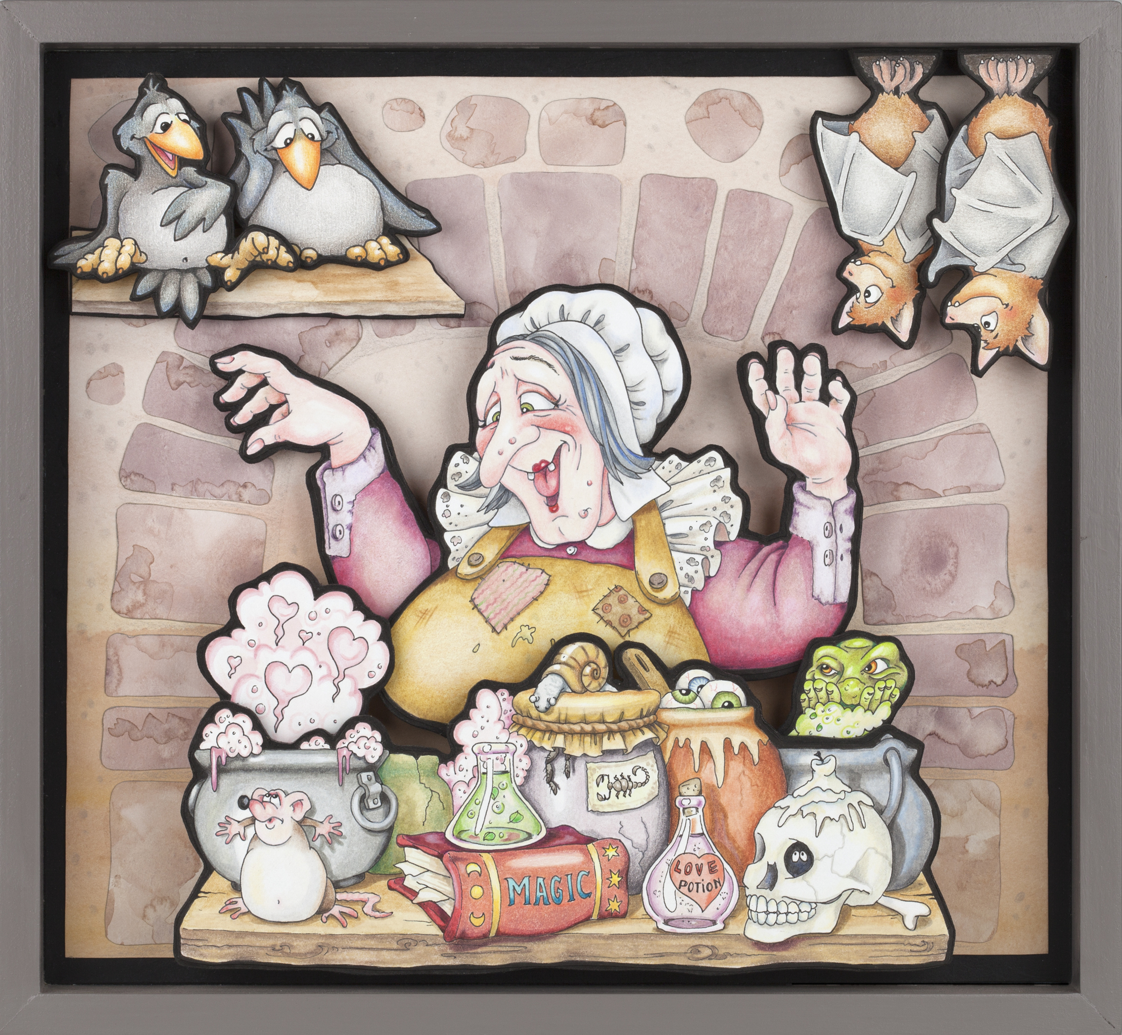 Het liefst maak ik verhalende tekeningen met wat humor, geplaatst in drie-dimensionale houten kistjes. Maar ook beeldhouwwerk, keramiek en textiel. Altijd figuratief met veel details.