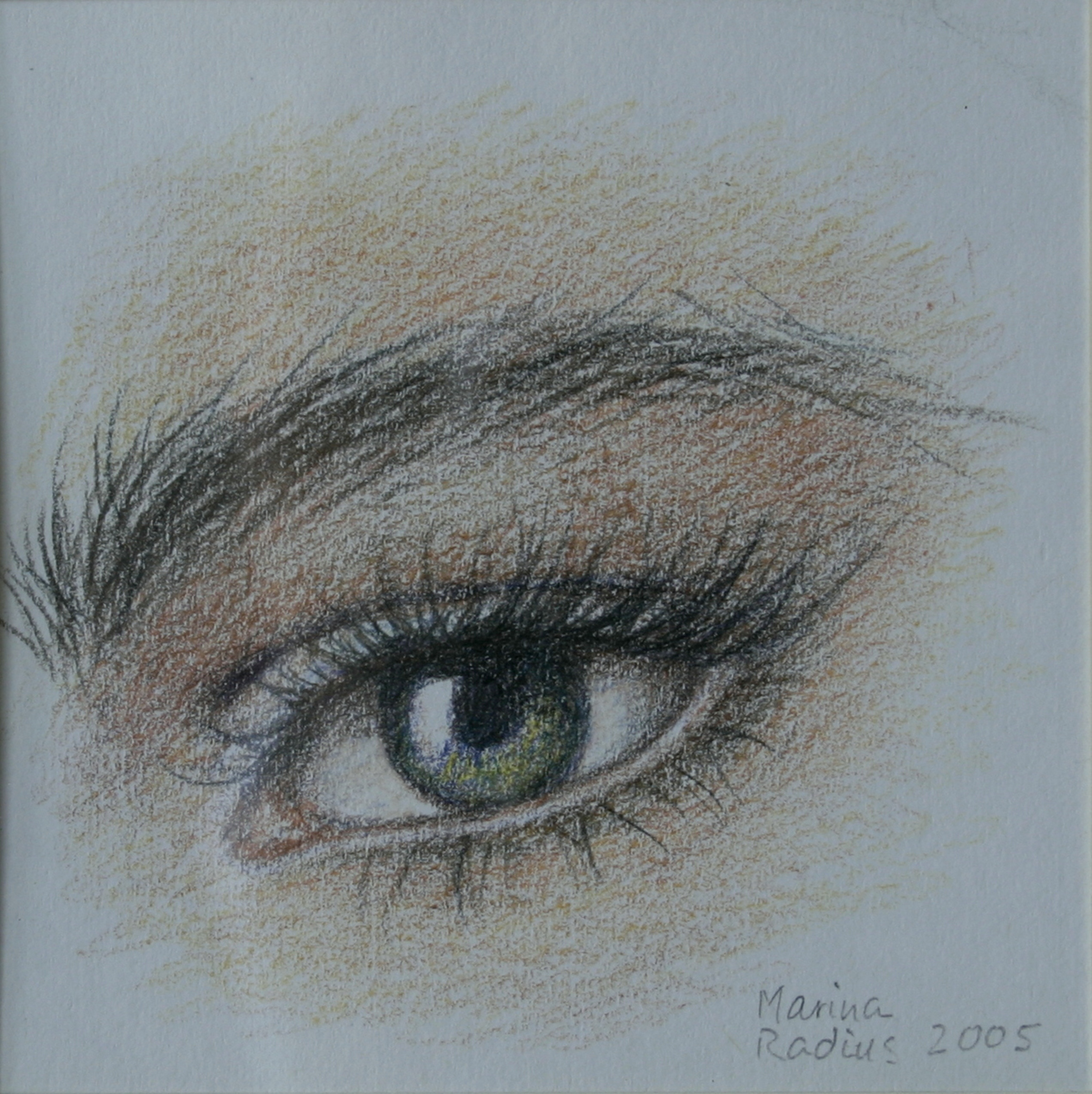 Groen oog, aquarel/kleurpotlood. Ingelijst met passe partout en glas 18x18 cm.