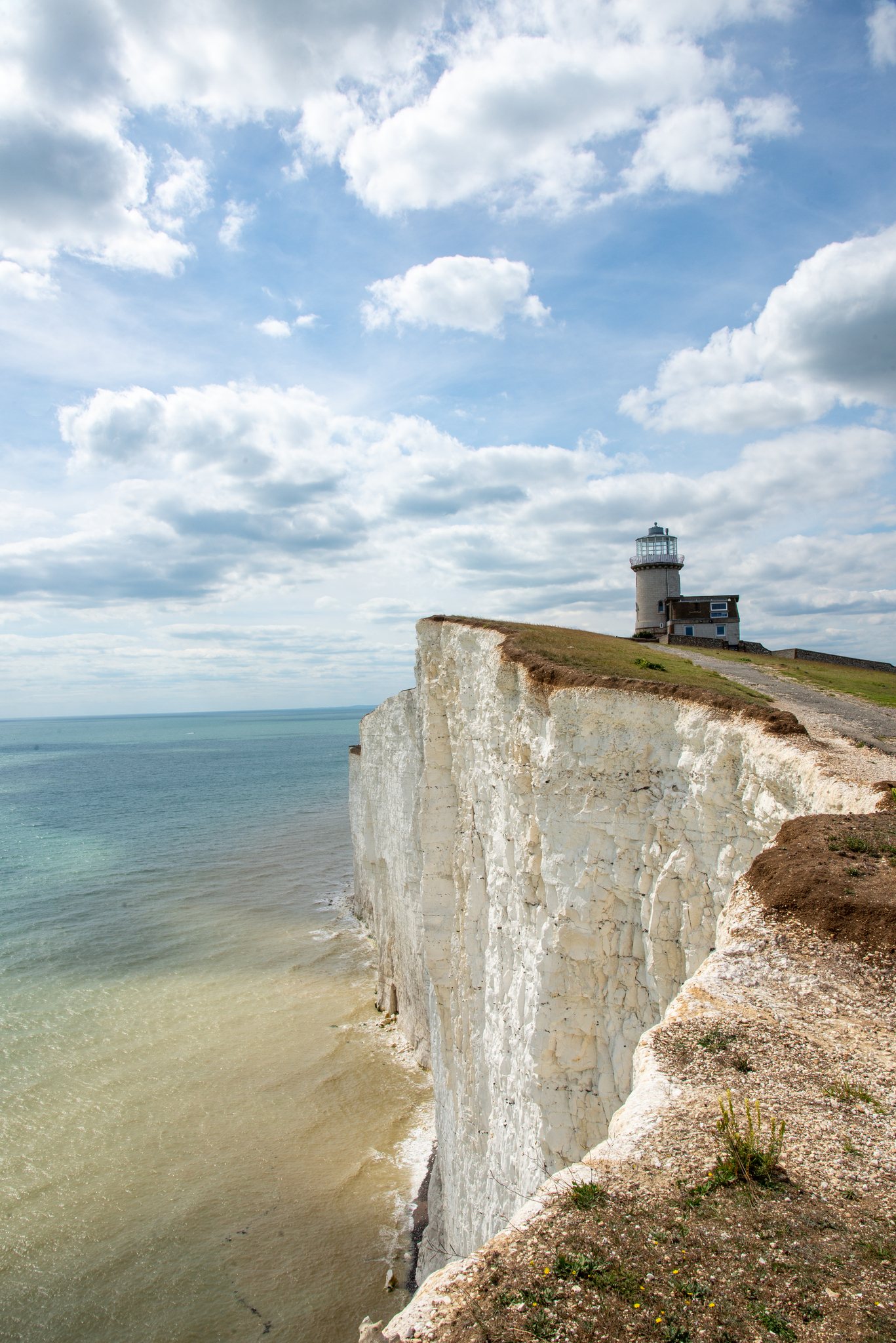 Langs de prachtige krijtrotsen bij Beachy Head aan de zuidkust van Engeland staat op de rand van de klif de historische vuurtoren Belle Toute