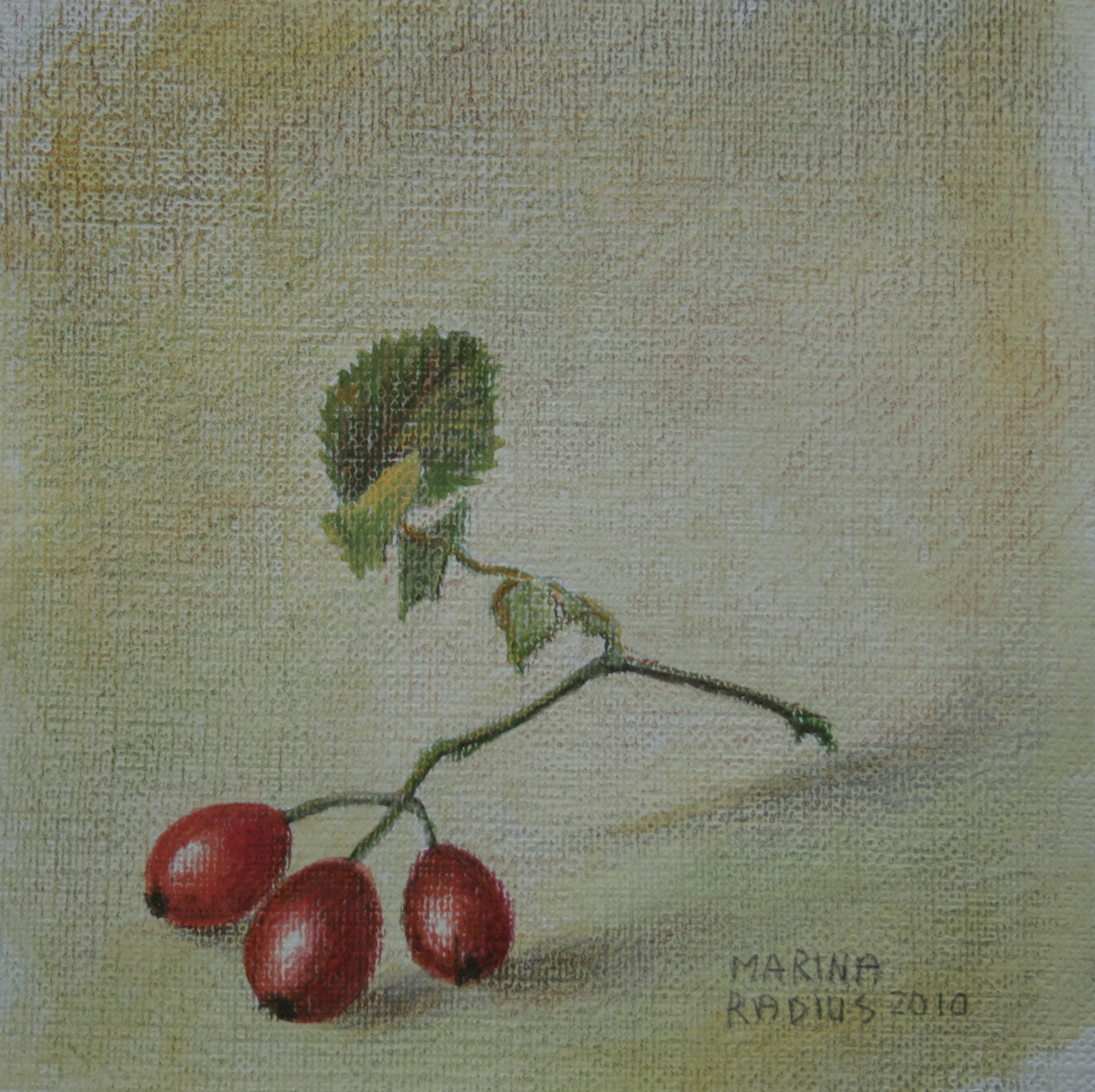 Rozenbottels, aquarel/ kleurpotlood. Ingelijst met passe partout en glas 18x18 cm.