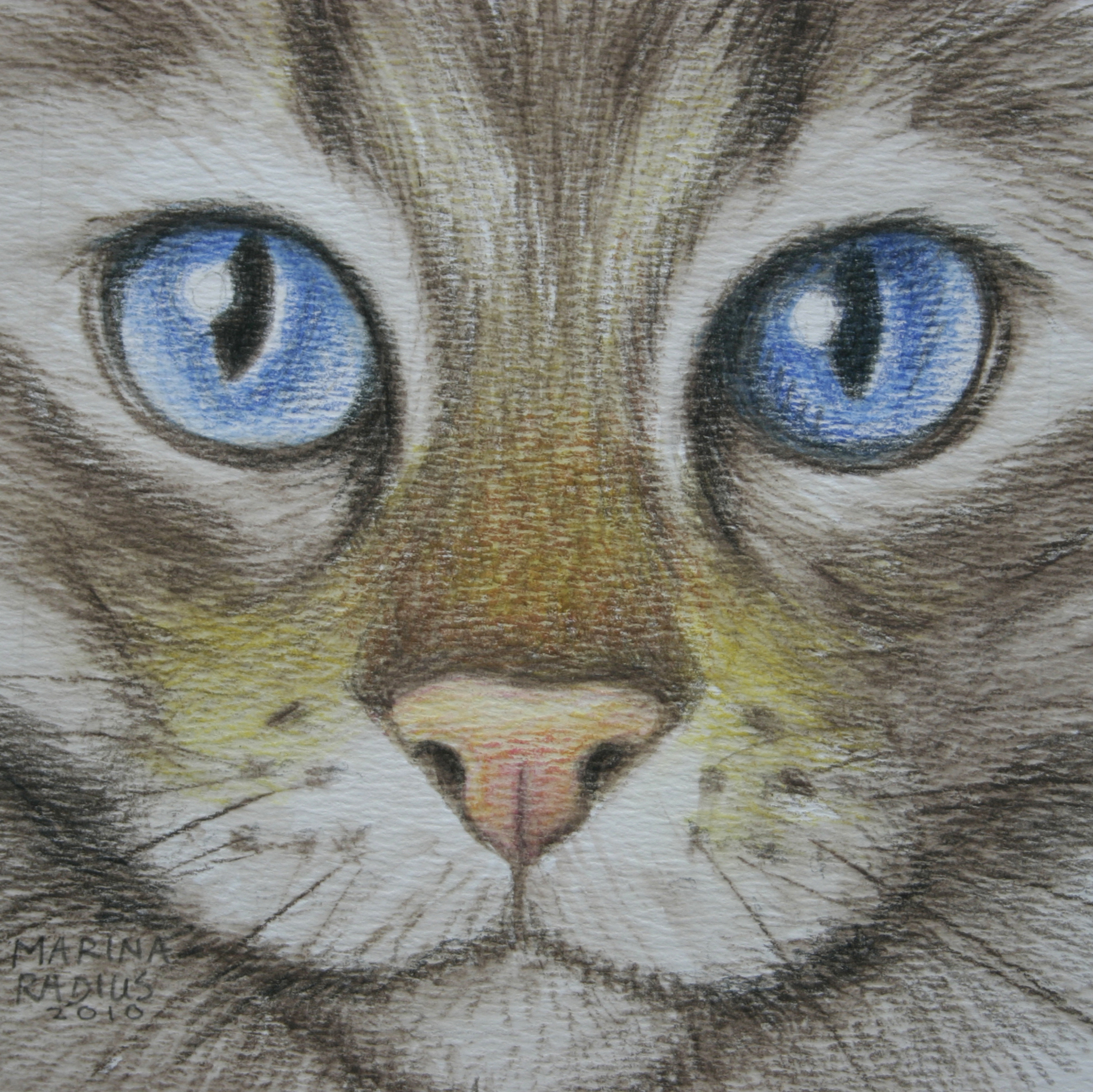 Poezenogen, blauw., aquarel/kleurpotlood. Ingelijst met passe partout en glas 18x18 cm.