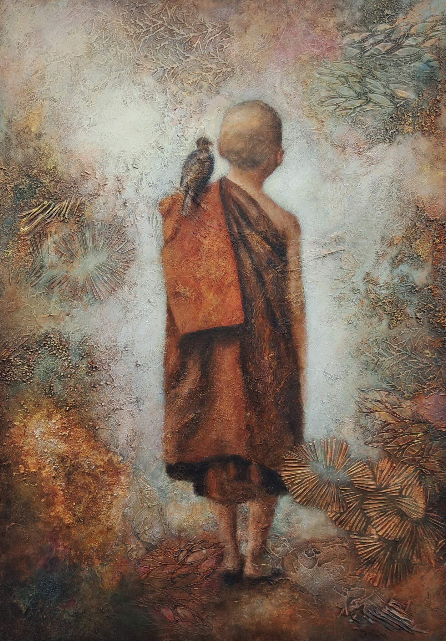 Monnik Bruintinten Aardetinten Mixed Media Spiritueel