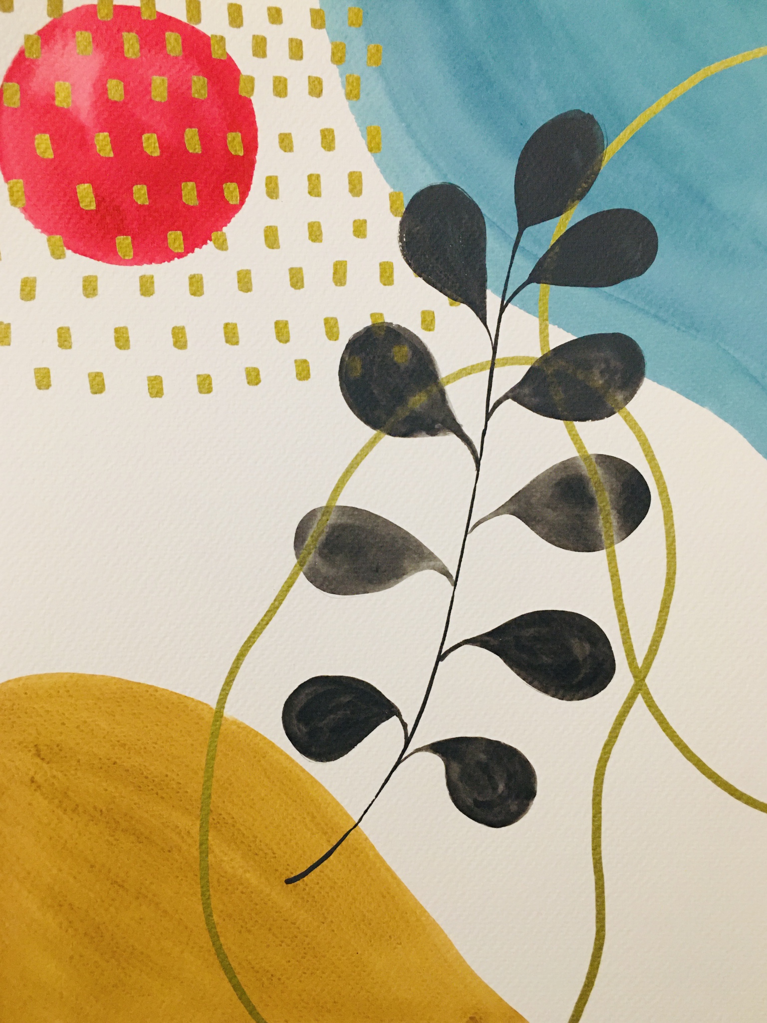 Aquarelschilderij, 2024 Deze moderne illustratie combineert een zwarte bladtak met speelse, abstracte vormen in heldere kleuren. Een felrode cirkel met gele stipjes, blauwe en okergele vlakken en golvende lijnen vullen de compositie. De contrasten tussen organische en geometrische vormen zorgen voor een dynamisch en eigentijds beeld. Het werk heeft een speels, grafisch karakter en is een echte blikvanger in een modern interieur.