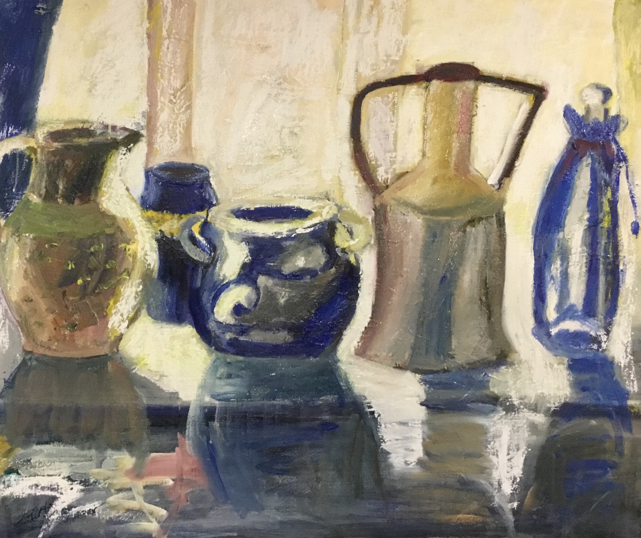 tegenlicht, potten en kannen op vensterbank olieverf op linnen 100x120