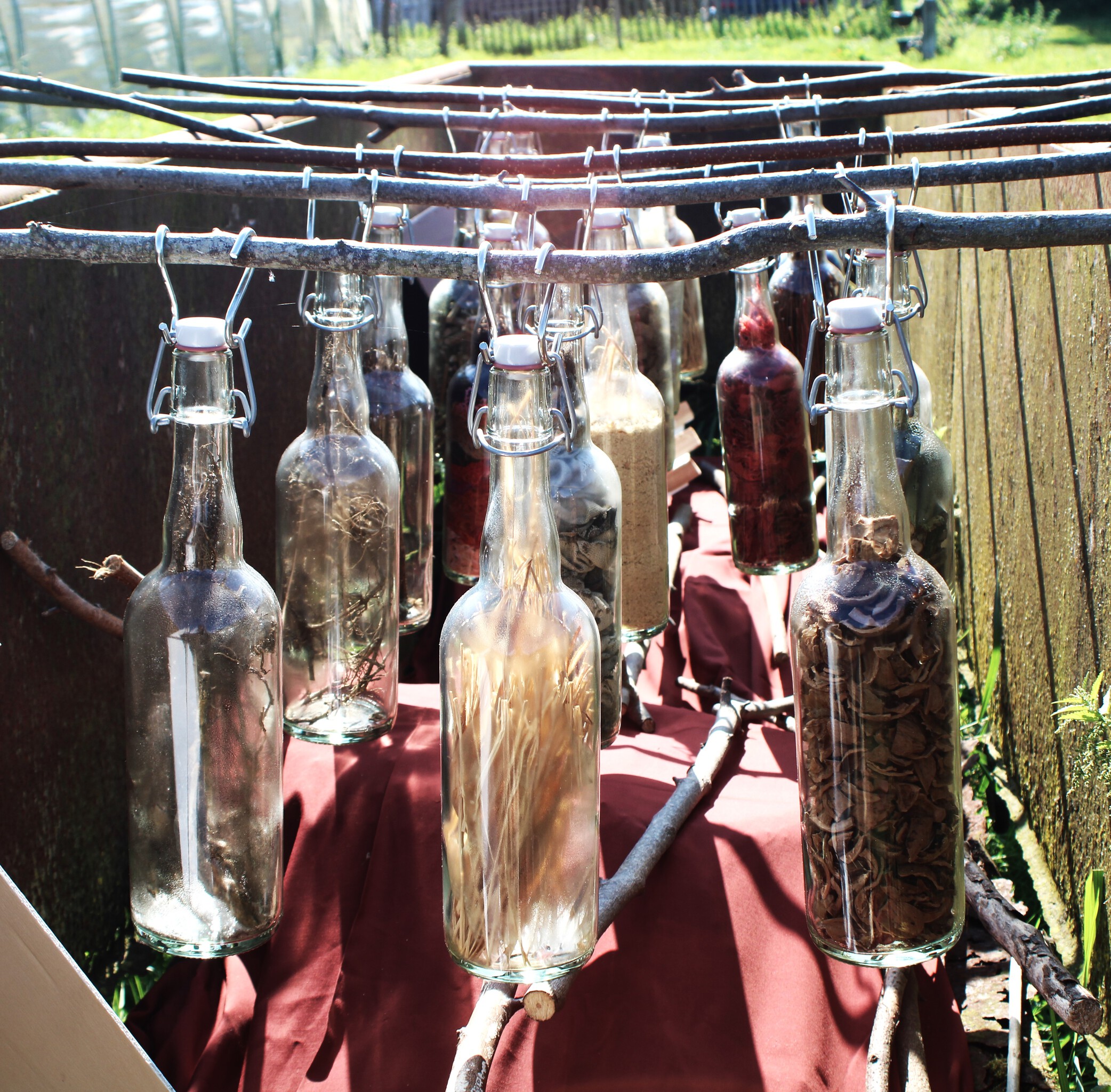 Flesjes, gevuld met van alles en nog wat; pitschillen, notenschillen, stokjes, takjes, draden, stukken stof, spijkers en meer. Dingen waarvan ik denk dat het handig zal zijn ‘voor wanneer we terugkeren’. In de metalen bak, als een soort voorraadkast; goed opgeborgen. Laat het daar veilig zijn tegen grijpgrage vingers in afwachting van later.