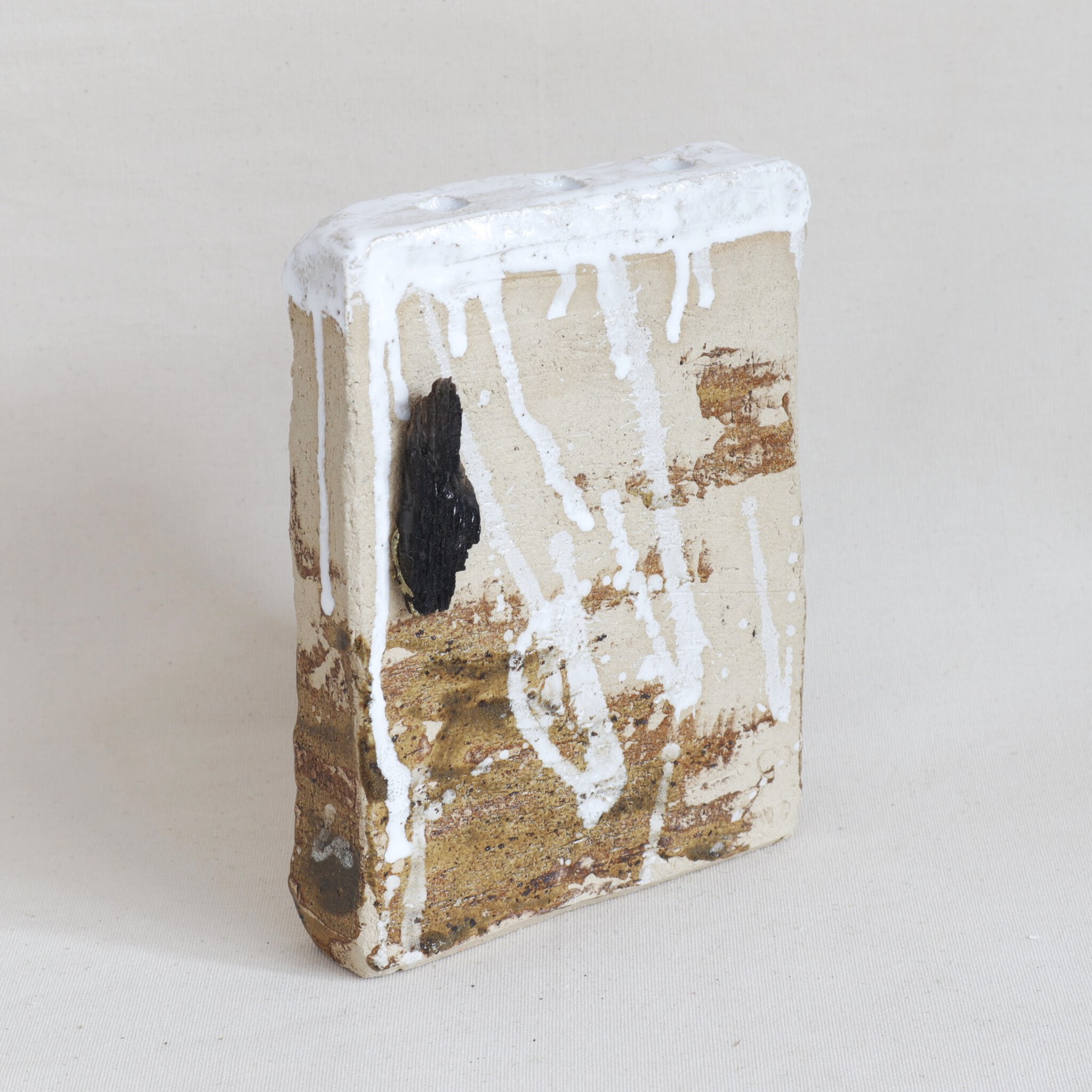 Kurinuki stijl tulpenvaas (gerbera's mag ook), witte klei, gedecoreerd met klei uit de Waddenzee en wit glanzend glazuur.
