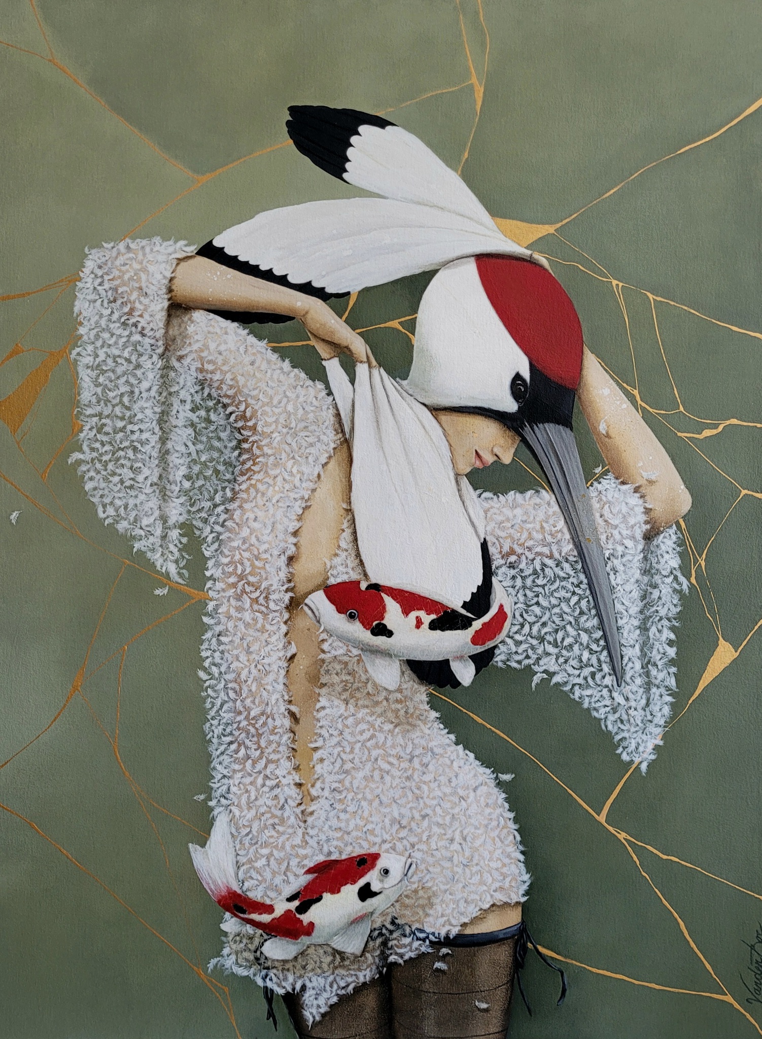 Sold Deze kraanvogelvrouw is geinspireerd op typisch Japanse thema's, zoals koivissen en kintsugi-kunst (gelijmde scherven met goudpigmenten, waardoor kapotte stukken een nieuwe look krijgen, nog steeds zichtbaar gebroken maar versierd met goud) In mijn schilderijen kom je vaak vissen tegen omdat vissen voor mij 'geluk' vertegenwoordigen en uiteraard heb ik hier gekozen voor koi karpers i.p.v. goudvis of haring. Dit schilderij gaat over tegenslagen in het leven die je kunnen transformeren naar een betere versie van jezelf. Hoewel de littekens nog steeds zichtbaar zijn (kintsugi) ben je perfect zoals je bent, nog beter zelfs en rijker omdat je gegroeid bent. 'A new me' heeft geleerd van ervaringen uit het verleden en nu kiest ze ervoor om met geluk te flirten en te dansen.