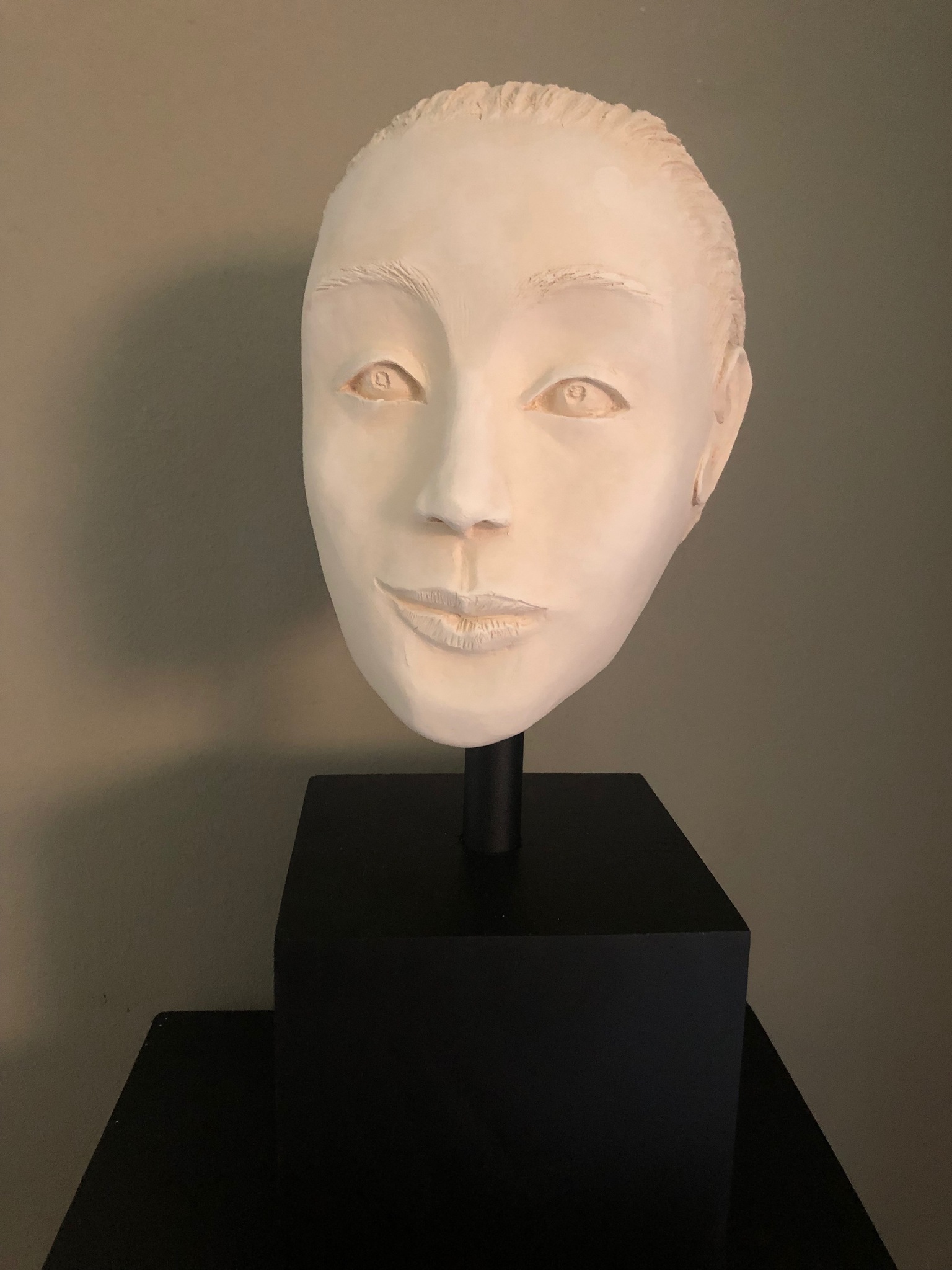 Wit keramiek vrouwenhoofd op zwarte sokkel.