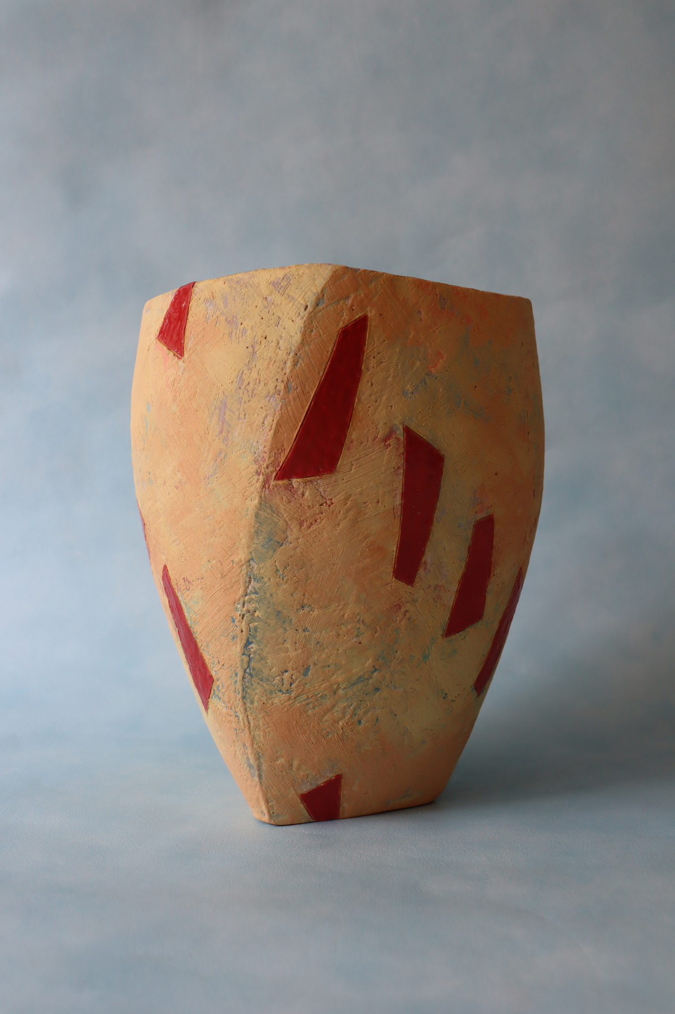Deze vaas is opgebouwd met rollen steengoedklei. Gedecoreerd met verschillende lagen ingekleurde kleislibs. De laatste laag is geel met rode dansende strookjes. De binnenkant is geglazuurd met een rode glazuur. Electrisch gestookt op 1160 ºC