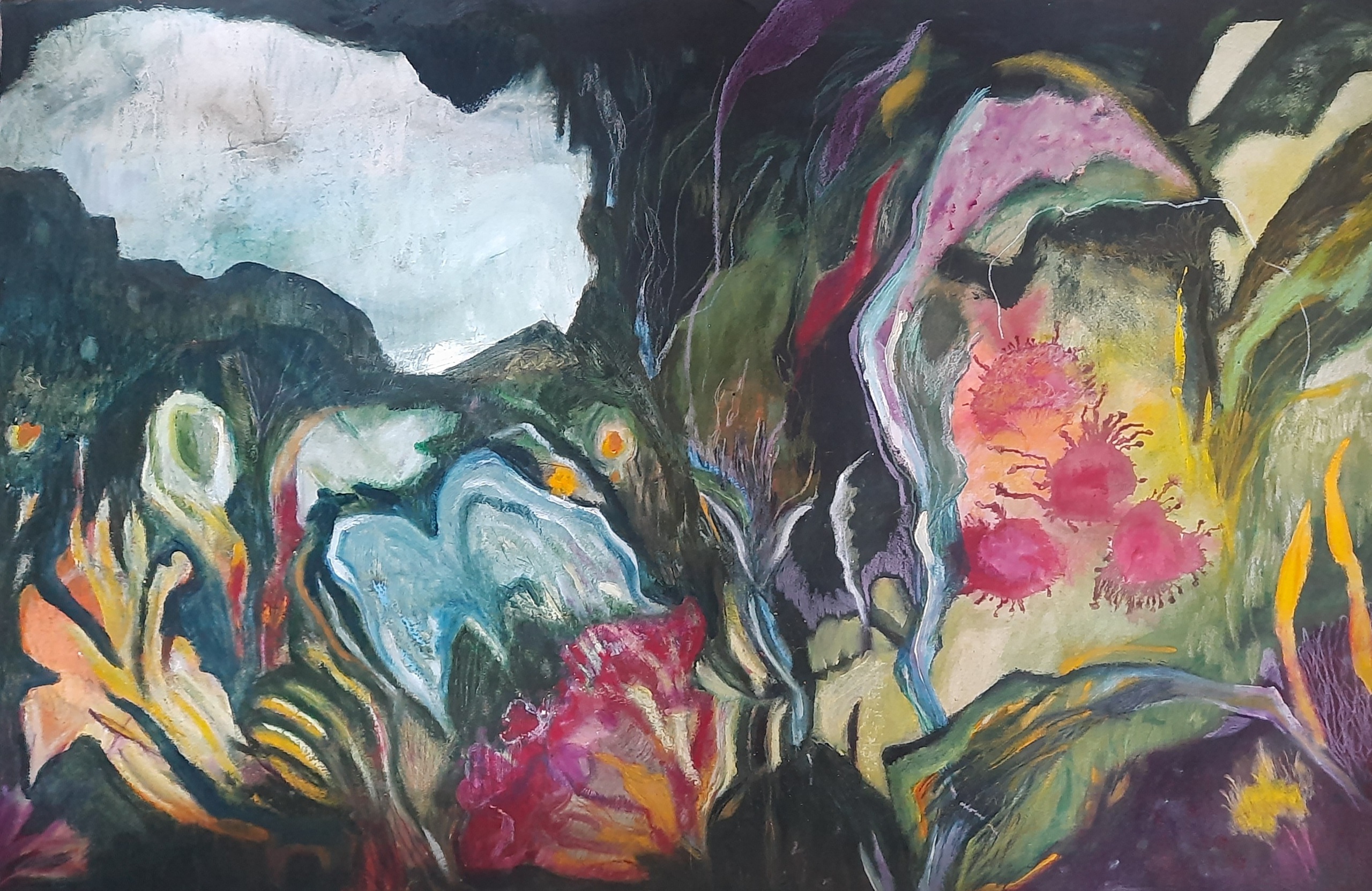 Olieverf, oliepastel, oliekleurpotlood en inkt op katoenpapier.