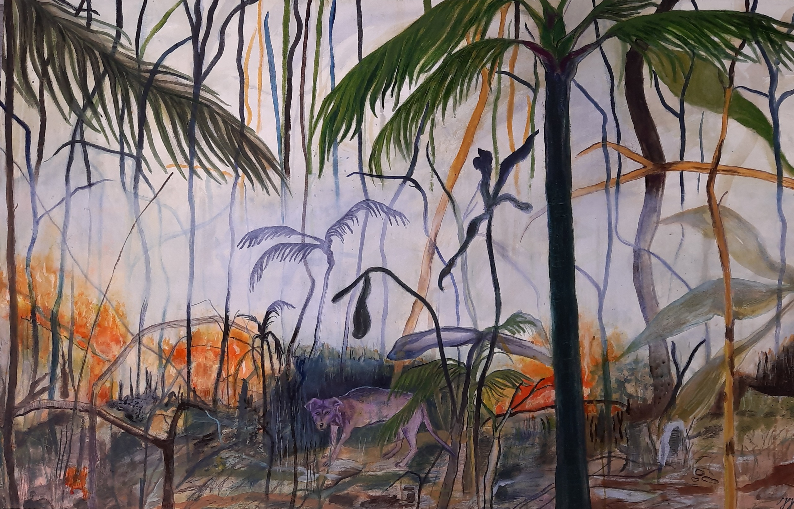 Olieverf, oliekleurpotloden en inkt op katoenpapier.