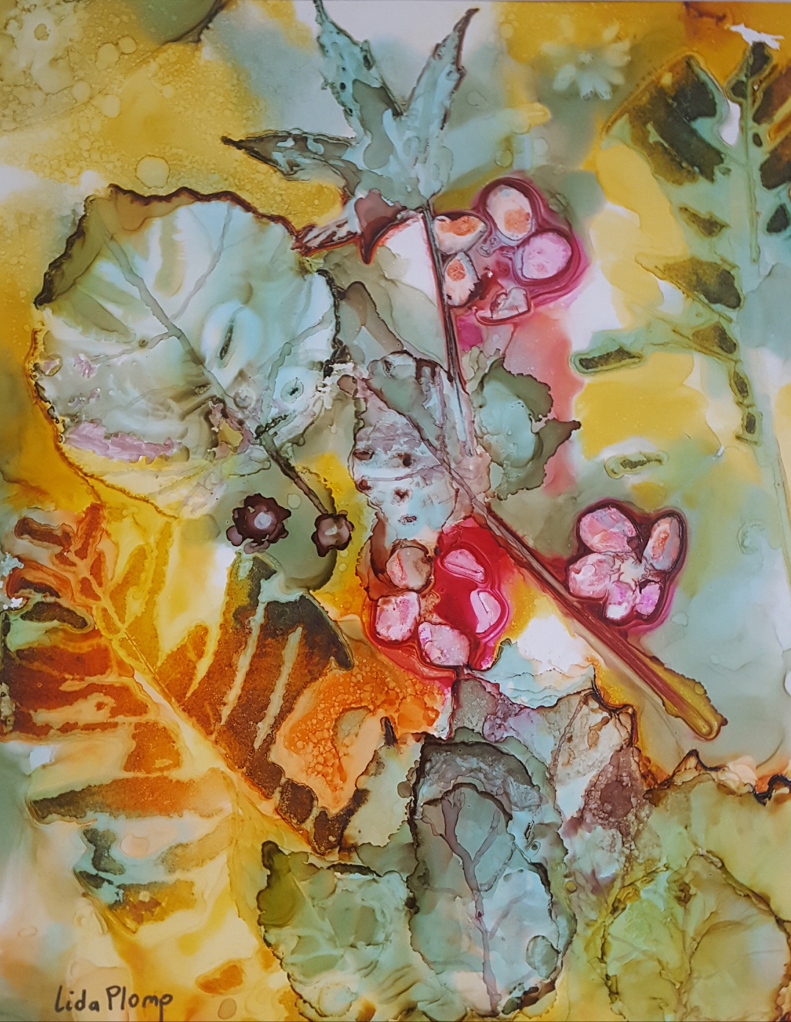 Abstract natuur met bladeren. Alcoholinkt op yupopapier in passepartout.