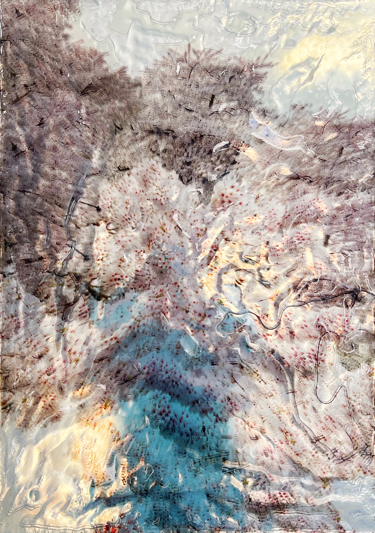 Schilderijen als wandelingen in een fictief landschap: natuurelementen die op elkaar inspelen, al dan niet met menselijke ingrepen.