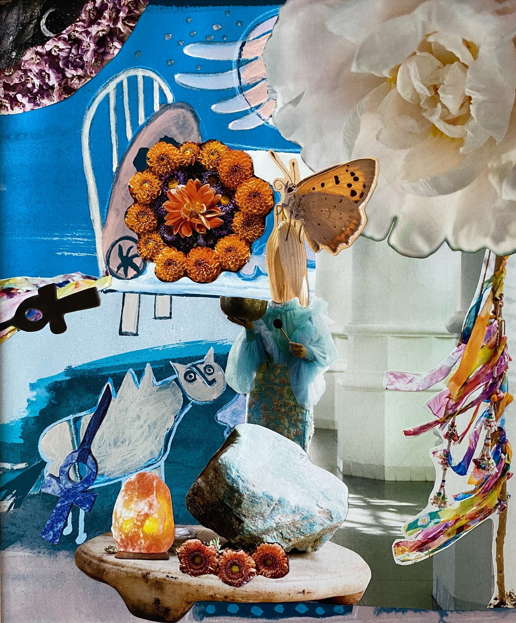 Blauw Bloemen Klankschaal Bed Roos Zoutlamp Vlinder Vlag Ankh Collage Papier Verhalend Surreeel Papierkunst Lijm Schaar Spiritueel Collagecoaching Coach Interpreteren Papierkunstenaar Intuïtief Flow Kleurig Bewegend