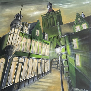 Schilderij bestaat uit twee doeken van 80 x 100 cm. Gewenste afstand tussen doeken is 7,5 cm. Beide doeken zijn ingelijst, luxe zwarte baklijst met zilveren rand.