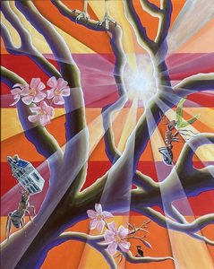 Zon Abstract Figuratief Rood Oranje Blauw Licht Boom Surreëel Tak Zonnestralen Delfts Insecten Mier