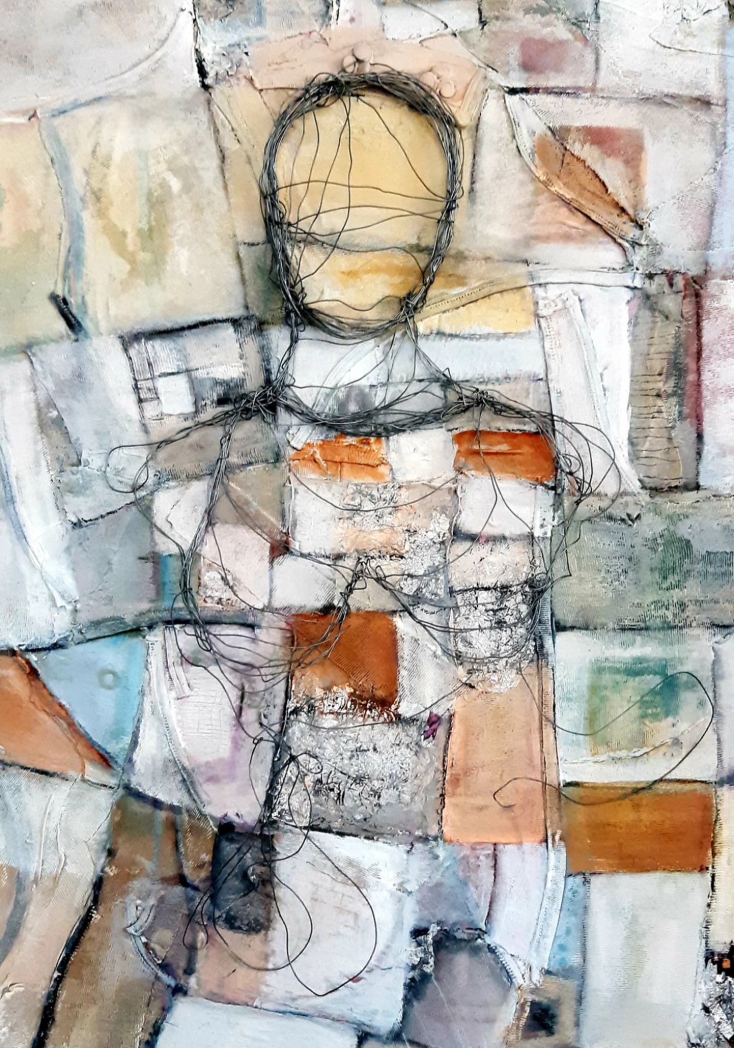 Abstract schilderij met daarop een draad kunstwerk uit 1 draad. Het kunst werk is gemaakt van oude lappen. Recycling van oude onder hemden.