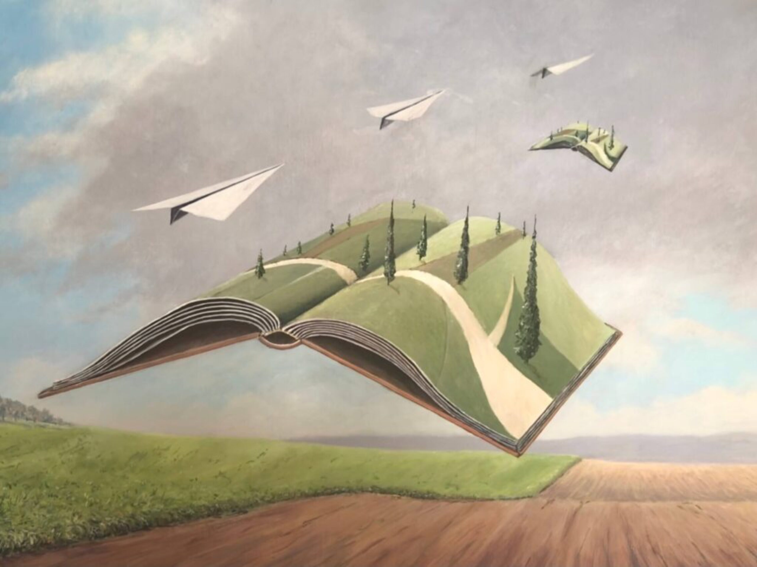 Acryl Escorte Vliegend Landschap Boek Surrealistisch