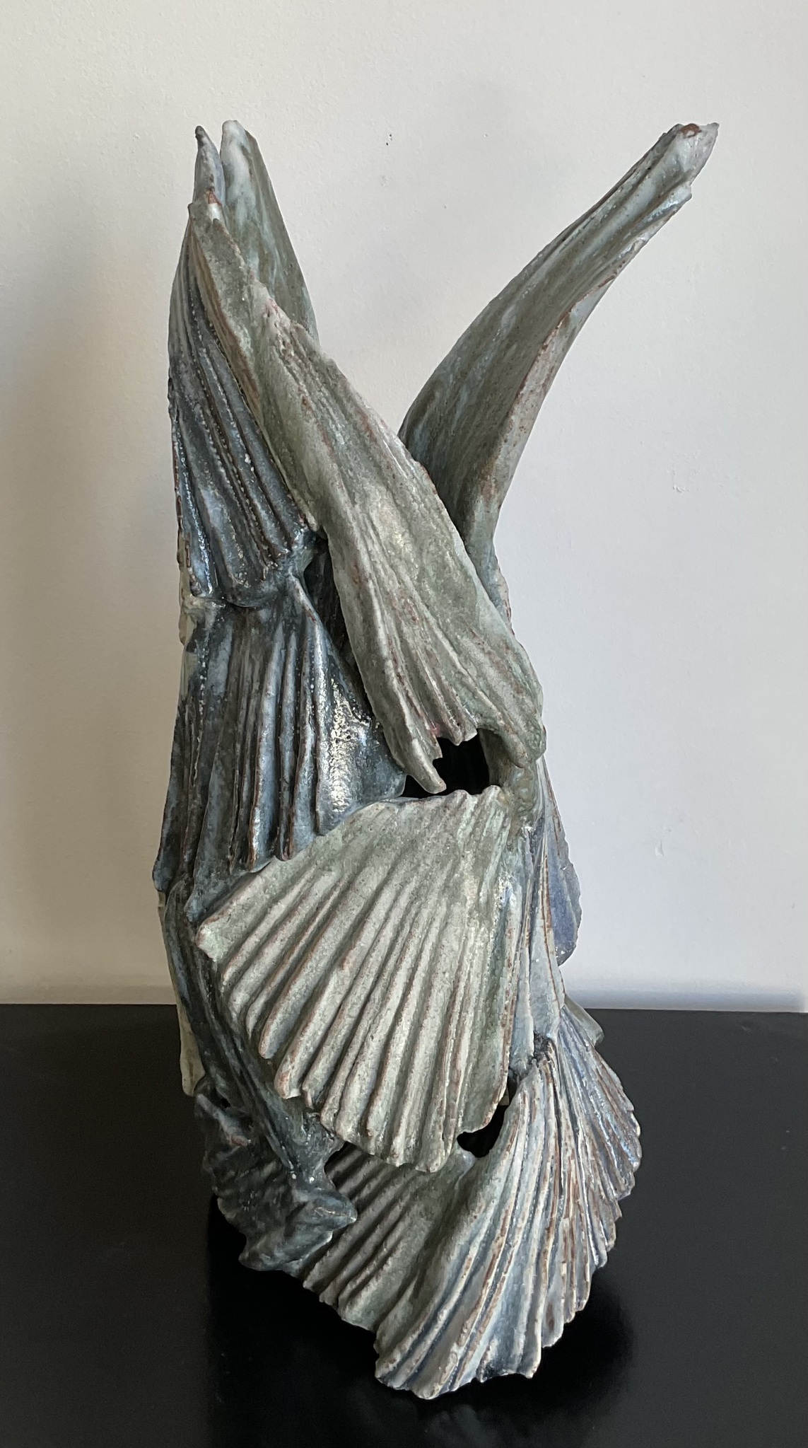 Zoektocht in keramiek: vrouwzijn in vloeiende lijnen en contouren; hoge dunne vaasvormen als weerspiegeling van een zoektocht naar identiteit...