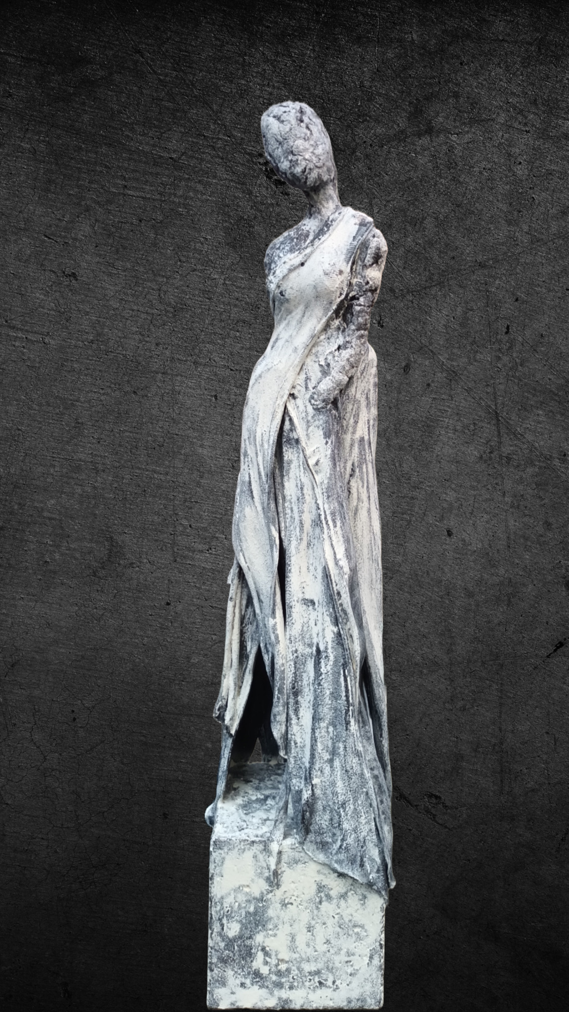 Hier ben ik en ik ben goed zoals ik ben. Beeld in klei, afgewerkt met textiel, paverpol en artstone op een betonnen sokkel.