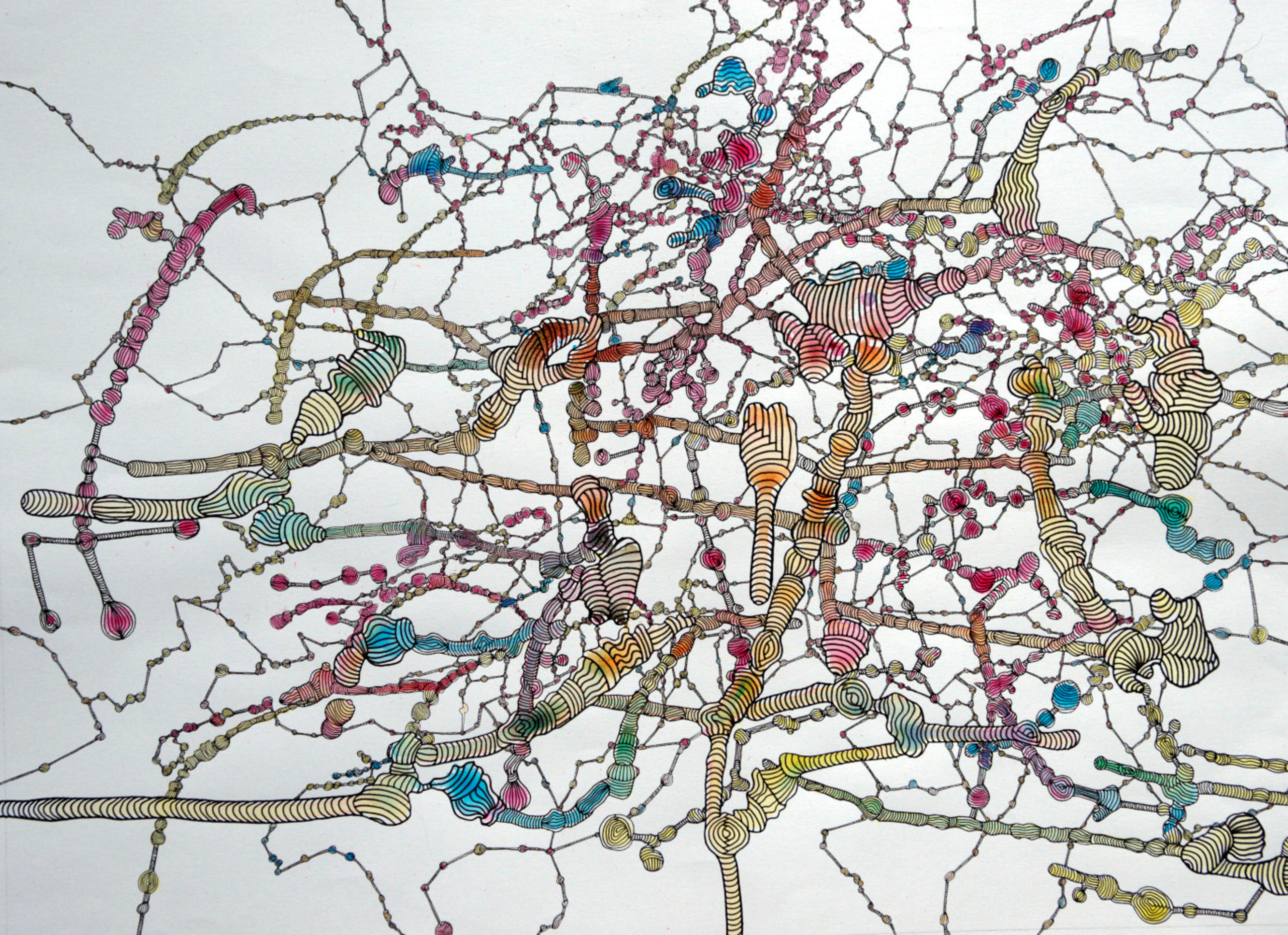 Door gebruik van acrylverf, kleurpotloden en inkt zijn deze abstracte vormen ontstaan.