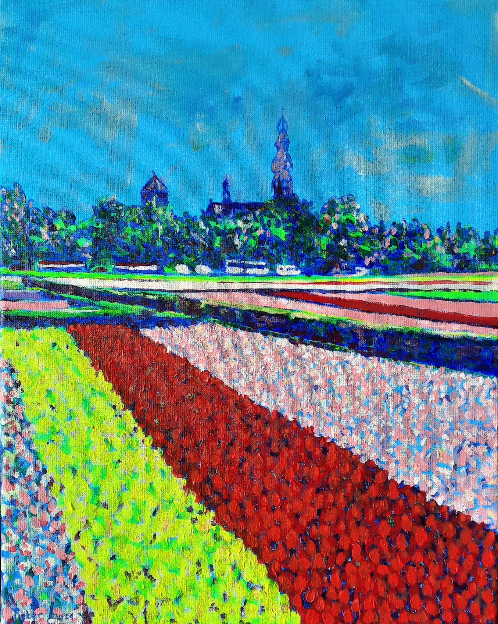 Bloeiende bollenvelden bij Lisse. Acryl op doek 40x50 cm April 2024