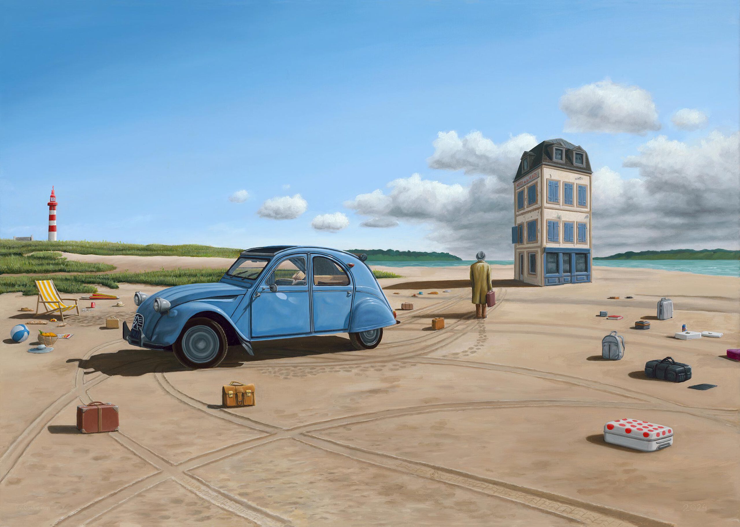 Een surrealistisch tafereel van een blauwe Citroën 2CV geparkeerd op een strand. Op de achtergrond staat een groot, vrijstaand hotel. Een persoon in een lange jas loopt over het strand richting het huis, terwijl er verschillende koffers en andere reisattributen verspreid liggen. Het geheel straalt een sfeer van verlatenheid en onwerkelijkheid uit.