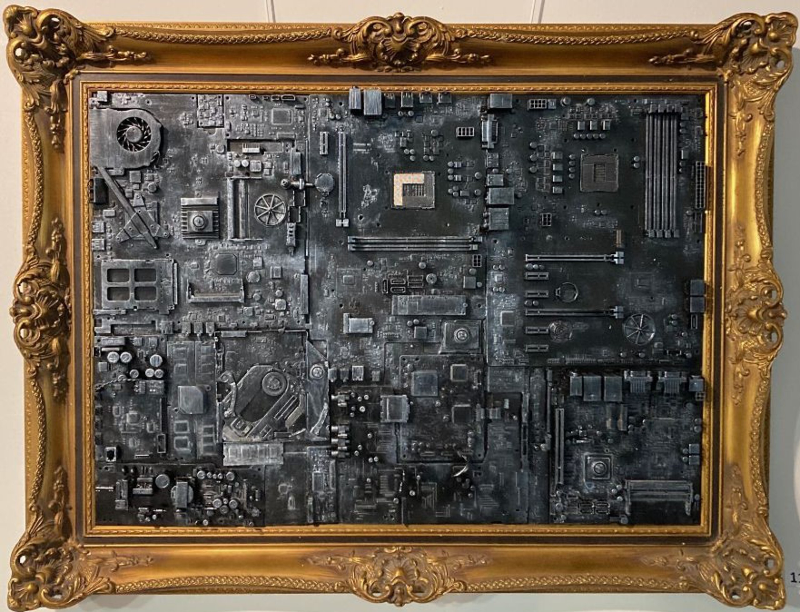 Gemaakt van een antieke schilderijlijst en onderdelen van computers, laptops en printers.