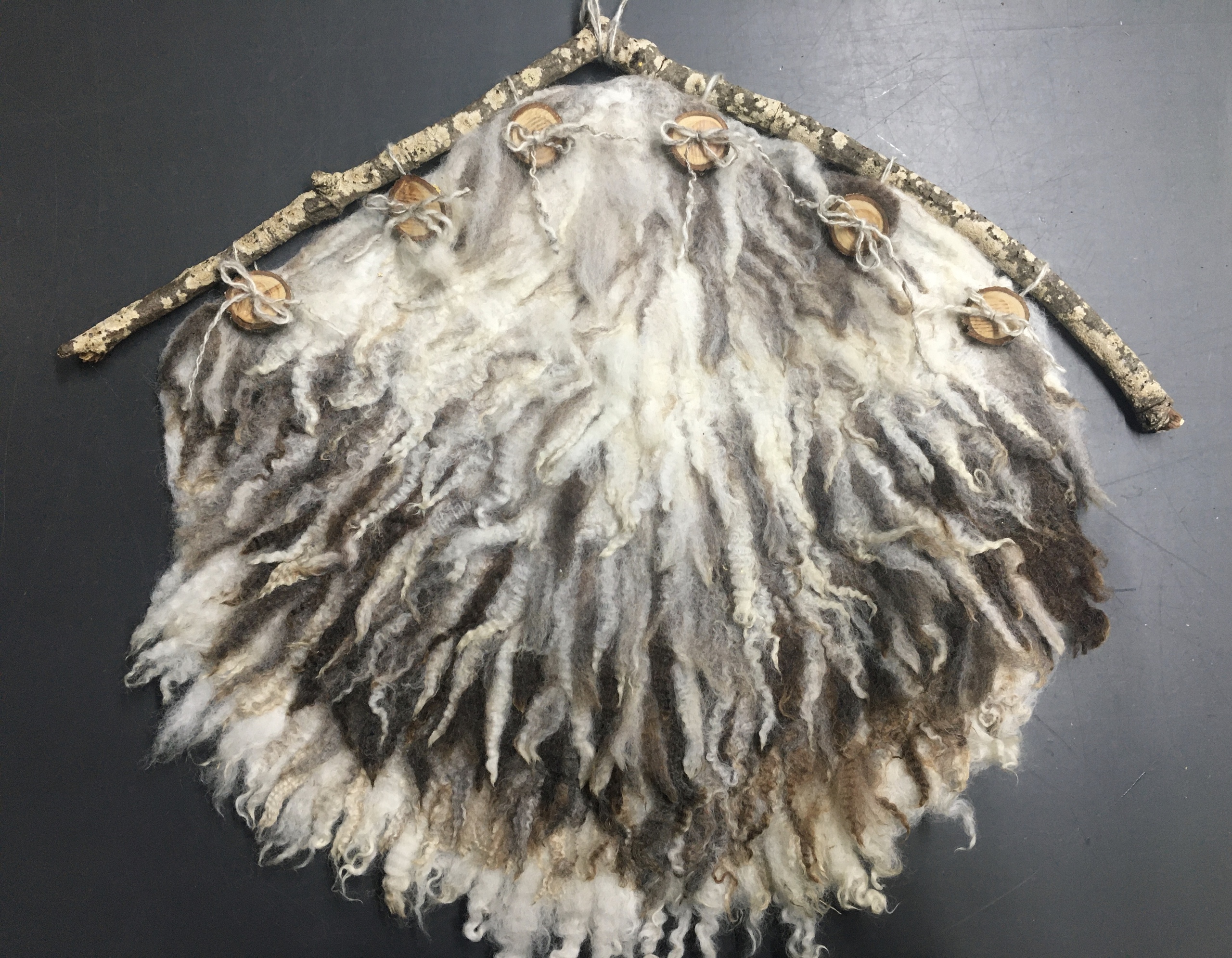 Textiel Wol Gevilt Vacht Langharig Grijs Bruin Wit Ecru Tak Appelboom Knopen Natuur Wandhanger Wandkleed Woonaccessoire