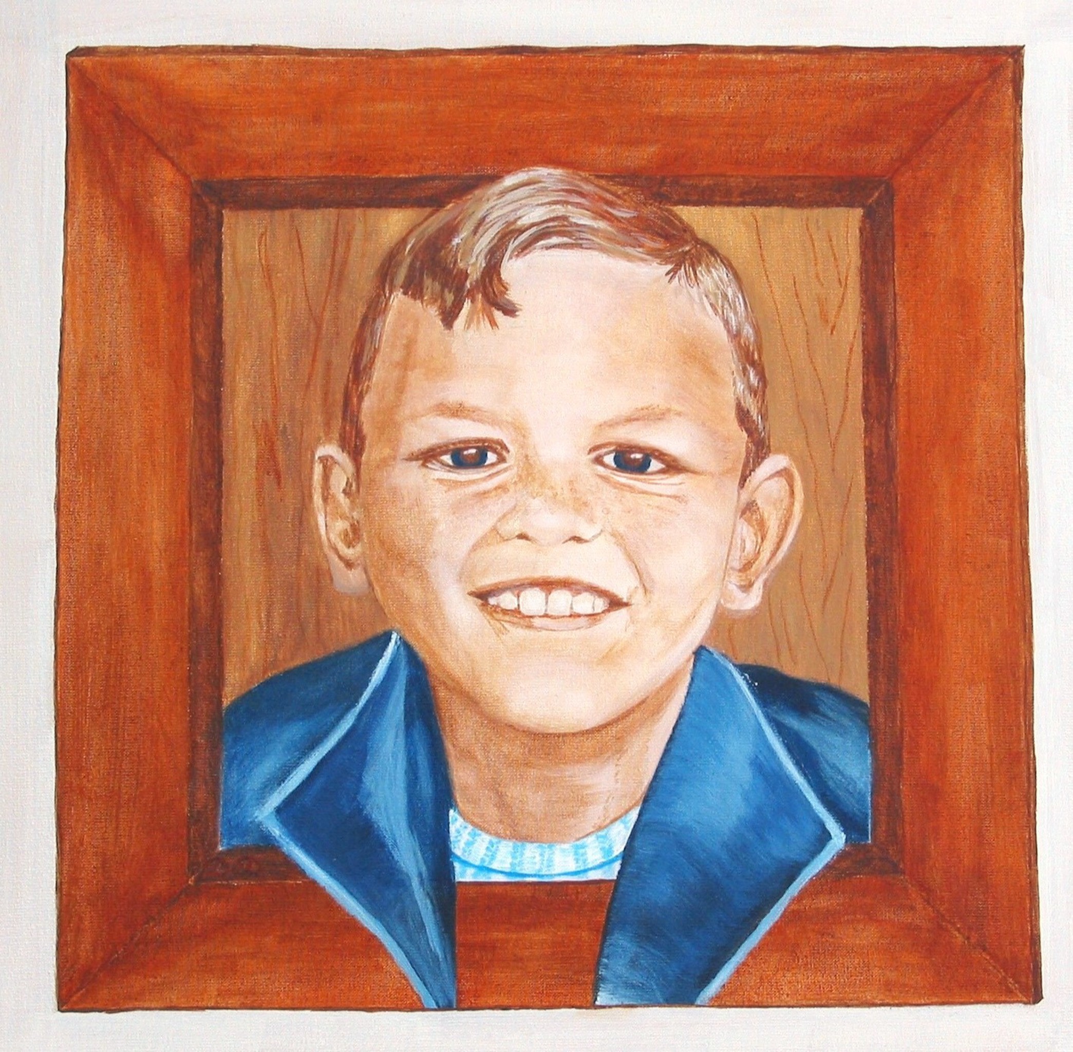 Mijn vader toen hij 13 was, nageschilderd van een zwart wit foto uit 1952. Een houten lijst geschilderd op een witte achtergrond.