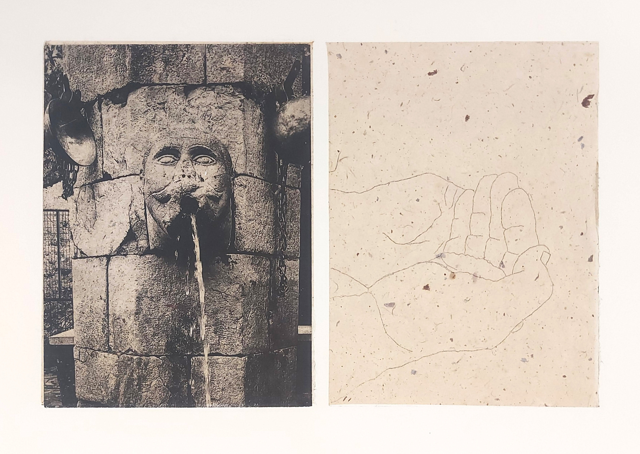 Toboyo prent gecombineerd met ets in zachte was. Ik heb hiervoor een foto gebruikt die gemaakt is in het waterrijke gebied van de Tsoumerka, een natuurgebied dichtbij onze woonplaats in Epirus. Hier zijn overal bronnen en waterbekkens. De foto-ets is gecombineerd met een ets in zachte was van een tekening van mijn handen, in een kom, als om water op te vangen. De ets is gedrukt op Chinees papier en verlijmd op het ets papier, een z.g. chine-colle Terwijl het water hier overal stroomt is in een ander deel van de wereld de watertoevoer moedwillig afgesneden..