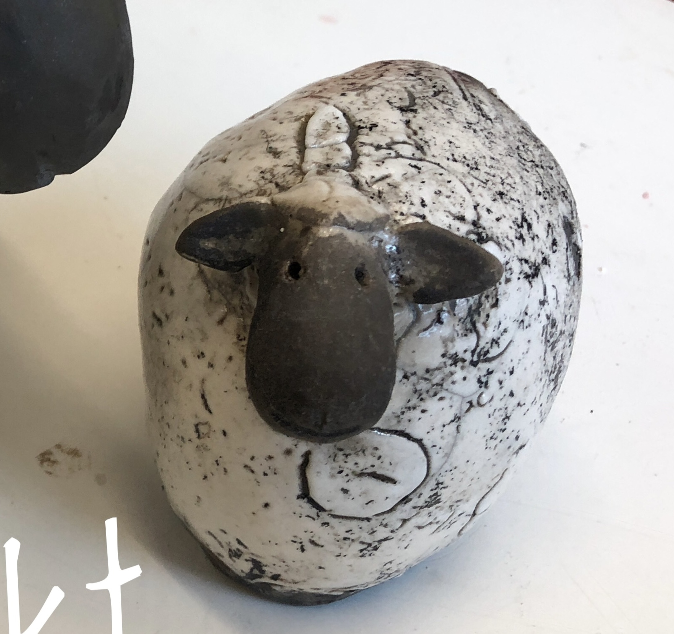 Het schaap is voor mij een favoriet en dankbaar onderwerp om elke keer weer tot een nieuwe unieke creatie te komen. Dit keer met na de bisqiutstook de tweede stook gedaan met de Raku techniek waardoor je het mooie zwart van roet en wit gecraqueleerde effect krijgt.