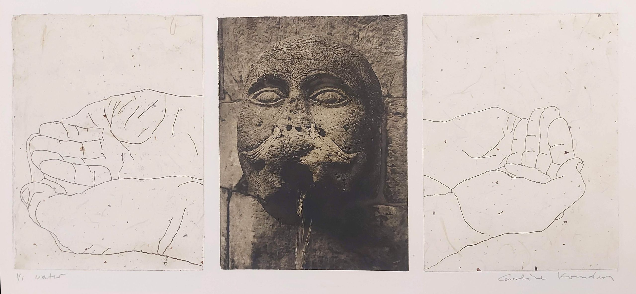 Toboyo prent gecombineerd met 2 enets in zachte was. Ik heb hiervoor een foto gebruikt die gemaakt is in het waterrijke gebied van de Tsoumerka, een natuurgebied dichtbij onze woonplaats in Epirus. Hier zijn overal bronnen en waterbekkens. De foto-ets is gecombineerd met twee etsen in zachte was van tekeningen van mijn handen, in een kom, als om water op te vangen. De ets is gedrukt op Chinees papier en verlijmd op het ets papier, een z.g. chine-colle Terwijl het water hier overal stroomt is in een ander deel van de wereld de watertoevoer moedwillig afgesneden..