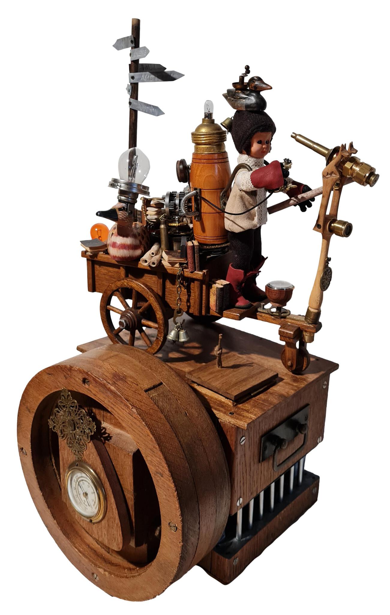 Een assemblage van een wereldreiziger door het leven, vol objecten die sporen dragen van ontdekking en avontuur.