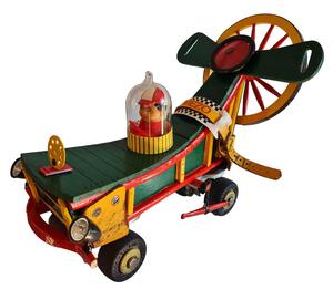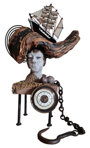 Een imposant vaartuig, gebouwd uit onverwachte voorwerpen zoals een schaats en een vleesmolen, varend tussen fantasie en werkelijkheid.