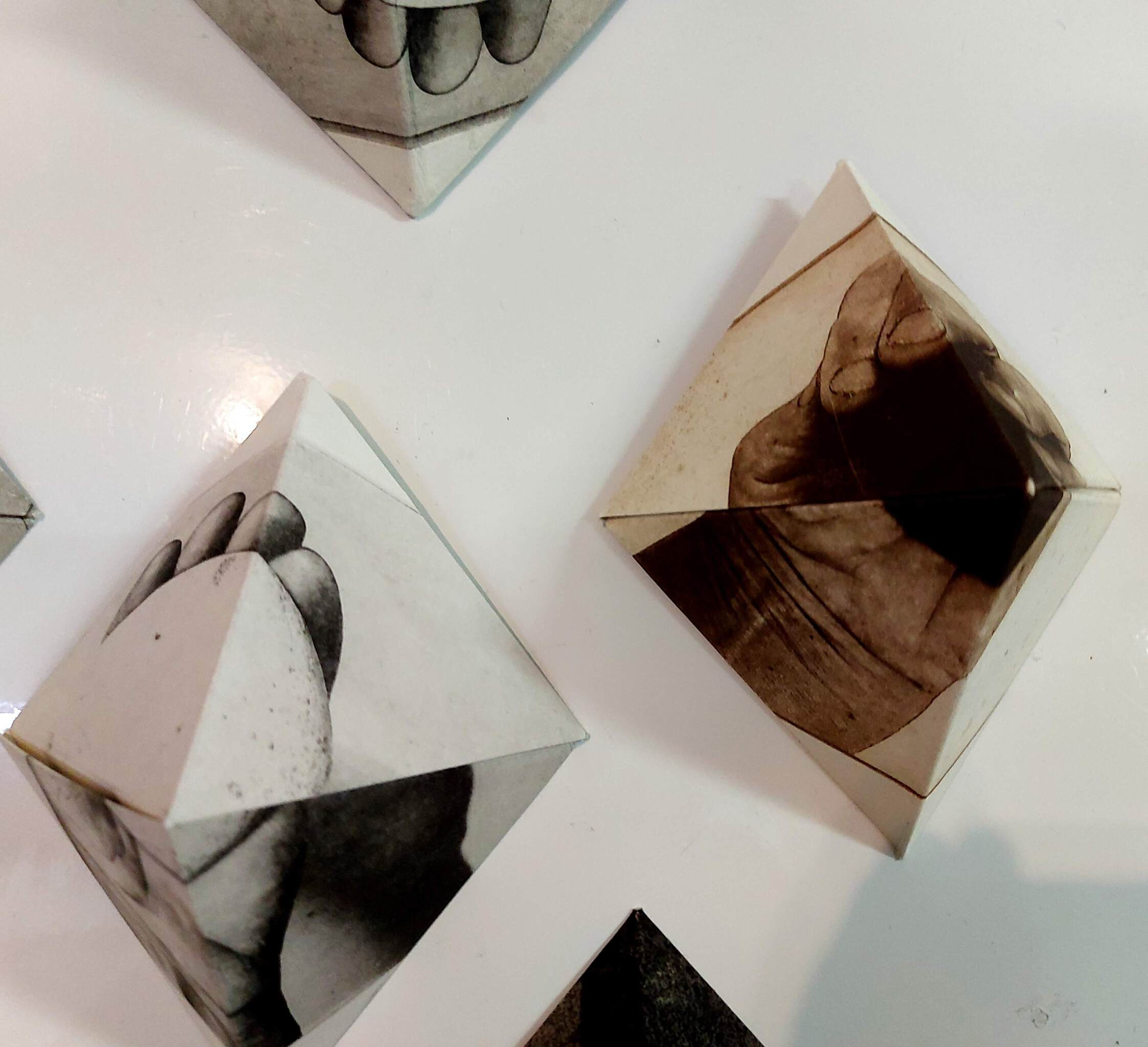Instalatie van tot pyramide gevouwen foto-etsen. De vormen zaten in mijn hoofd na een werkbezoek naar Egypte, Het uitgangspunt zijn etsen van mijn handen en die een steen vasthouden. Stenen duiken vaak op in mijn werk. Deze serie is het begin van een latere serie werken over handen en water. De werken zijn niet ingekaderd, de instalatie groeit nog.