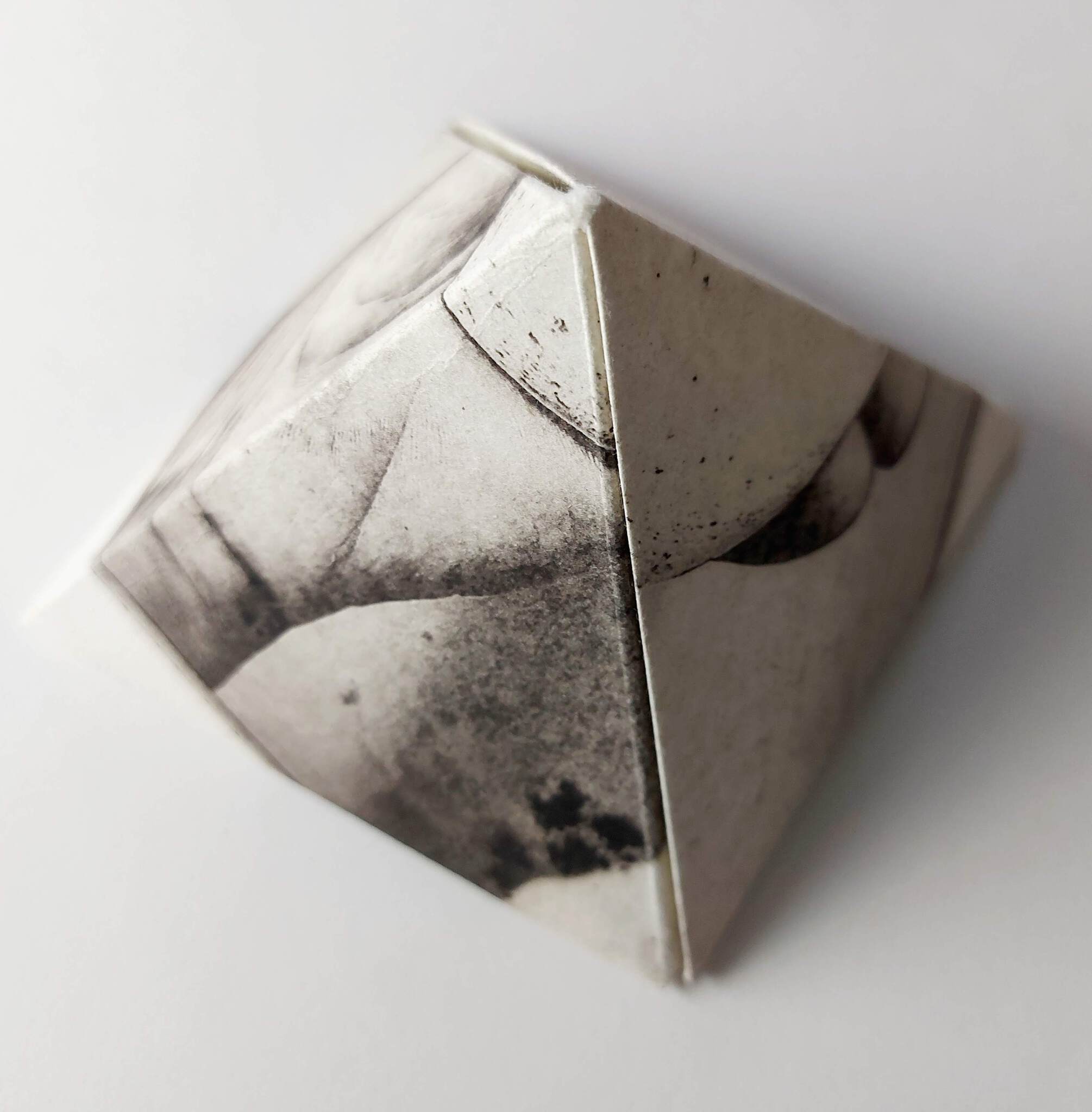 Instalatie van tot pyramide gevouwen foto-etsen. De vormen zaten in mijn hoofd na een werkbezoek naar Egypte, Het uitgangspunt zijn etsen van mijn handen en die een steen vasthouden. Stenen duiken vaak op in mijn werk. Deze serie is het begin van een latere serie werken over handen en water. De werken zijn niet ingekaderd, de instalatie groeit nog.