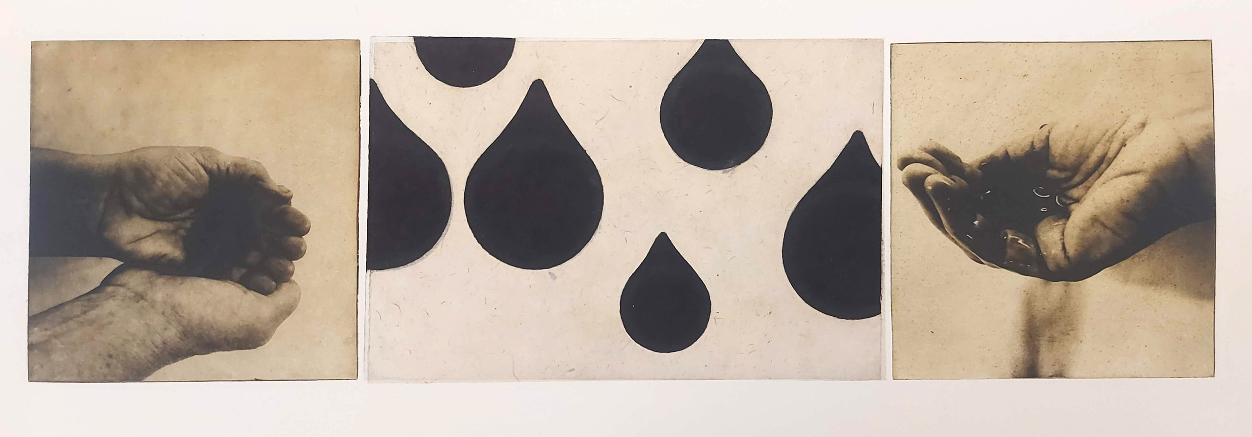 Toboyo prent gecombineerd met mezzotint.. Ik heb hiervoor foto's gebruikt die ik gemaakt heb van mijn handen die proberen vloeistof op te vangen. De foto-etsen zijn gedrukt in sienna en gecombineerd met een mezzotint waarop ik in diepzwart druppels heb gegraveerd . De mezzotint is gedrukt op zacht oker papier en verlijmd op het etspapier, een z.g. chine-colle Terwijl het water hier overal stroomt is in een ander deel van de wereld de watertoevoer moedwillig afgesneden..