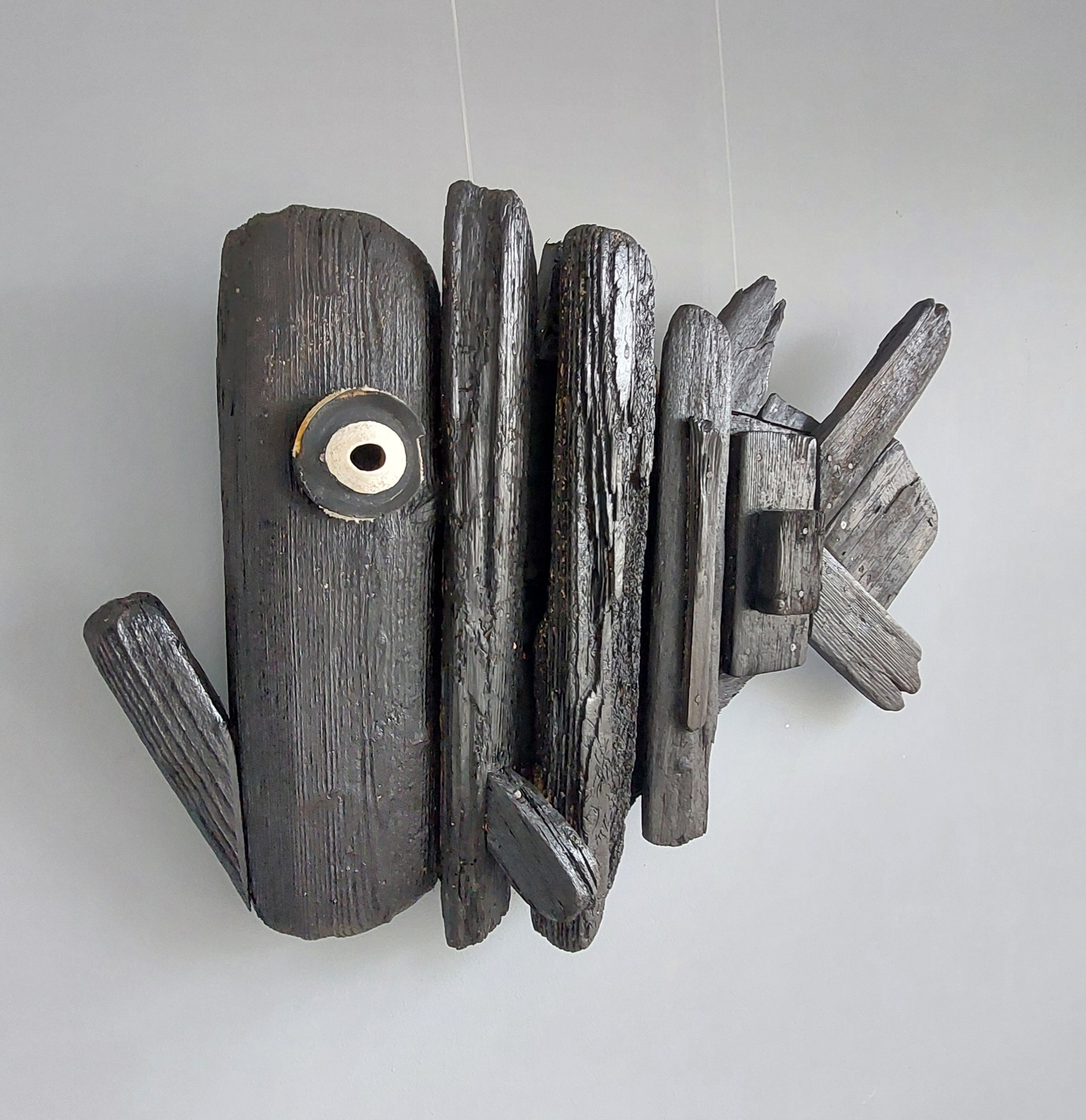 maakt al jaren houten beelden door natuurlijke objecten uit zee te koppelen. De beelden zijn ruw en puur.