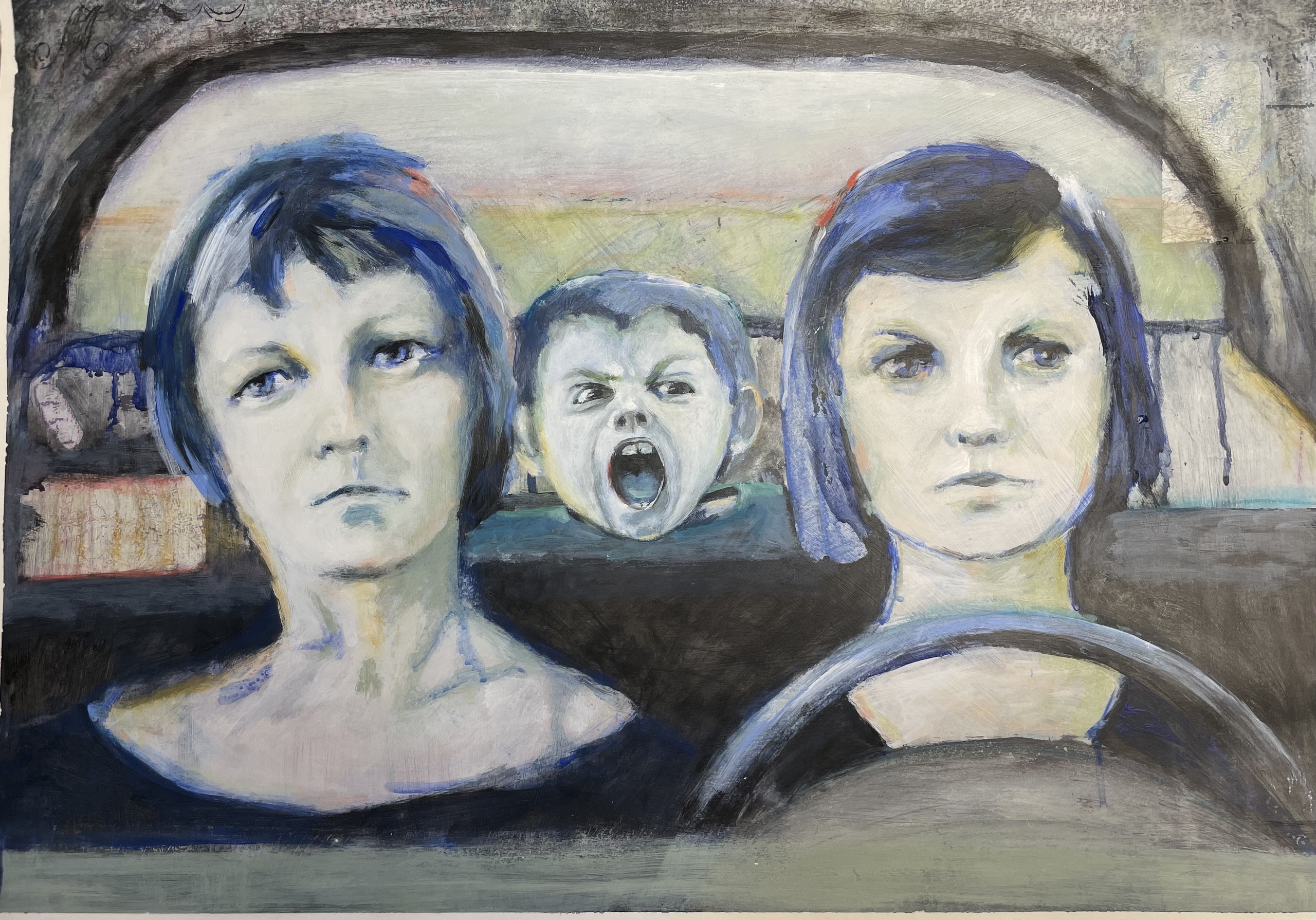 Voorin twee vrouwen die alle gevoel uit hun gezicht hebben verwijderd. Op de achterbank het vocale equivalent van een luchtaanval.