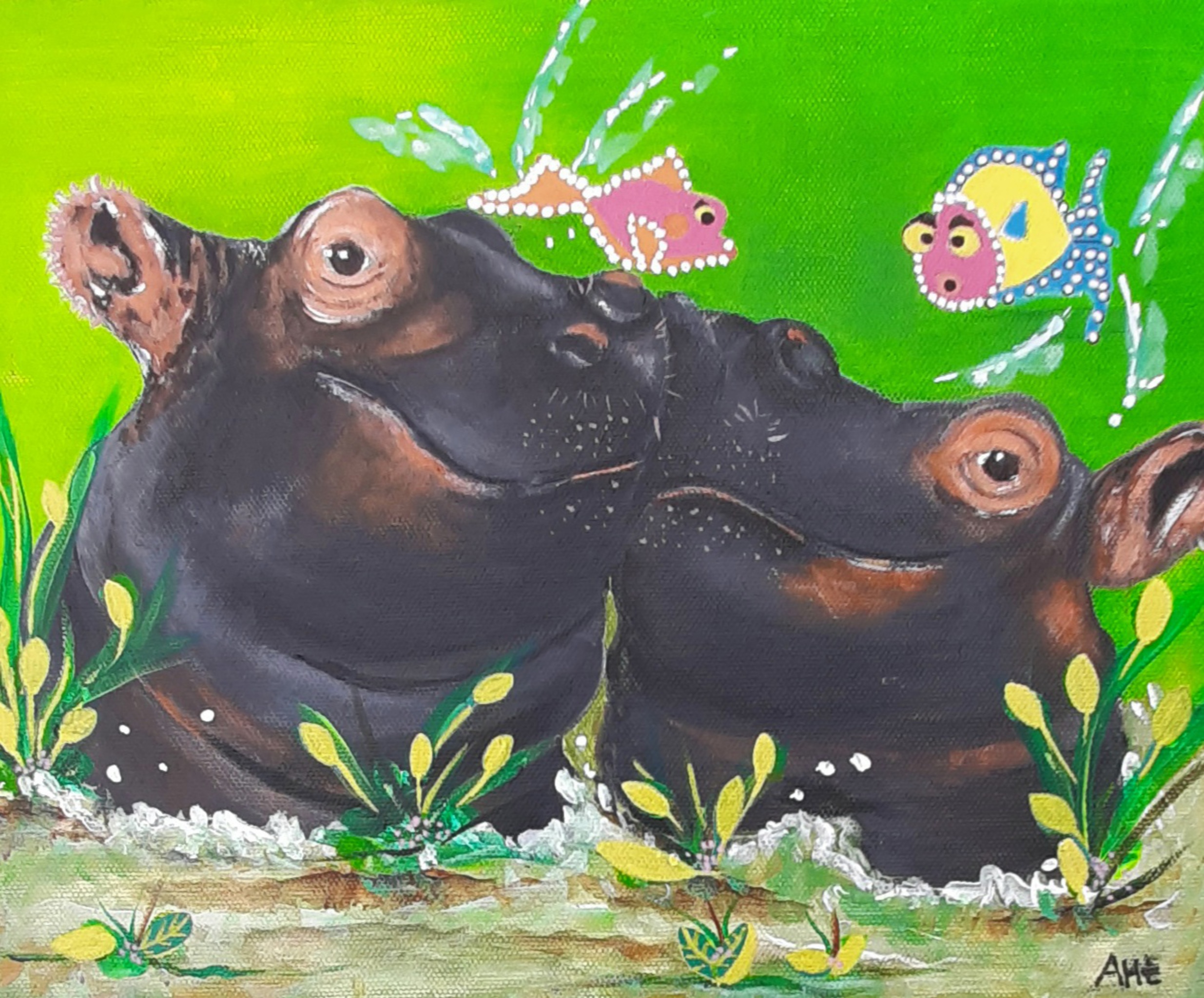 Leuk schilderij spetterende nijlpaarden maken hun eigen feestje in kleurrijk acryl op canvas