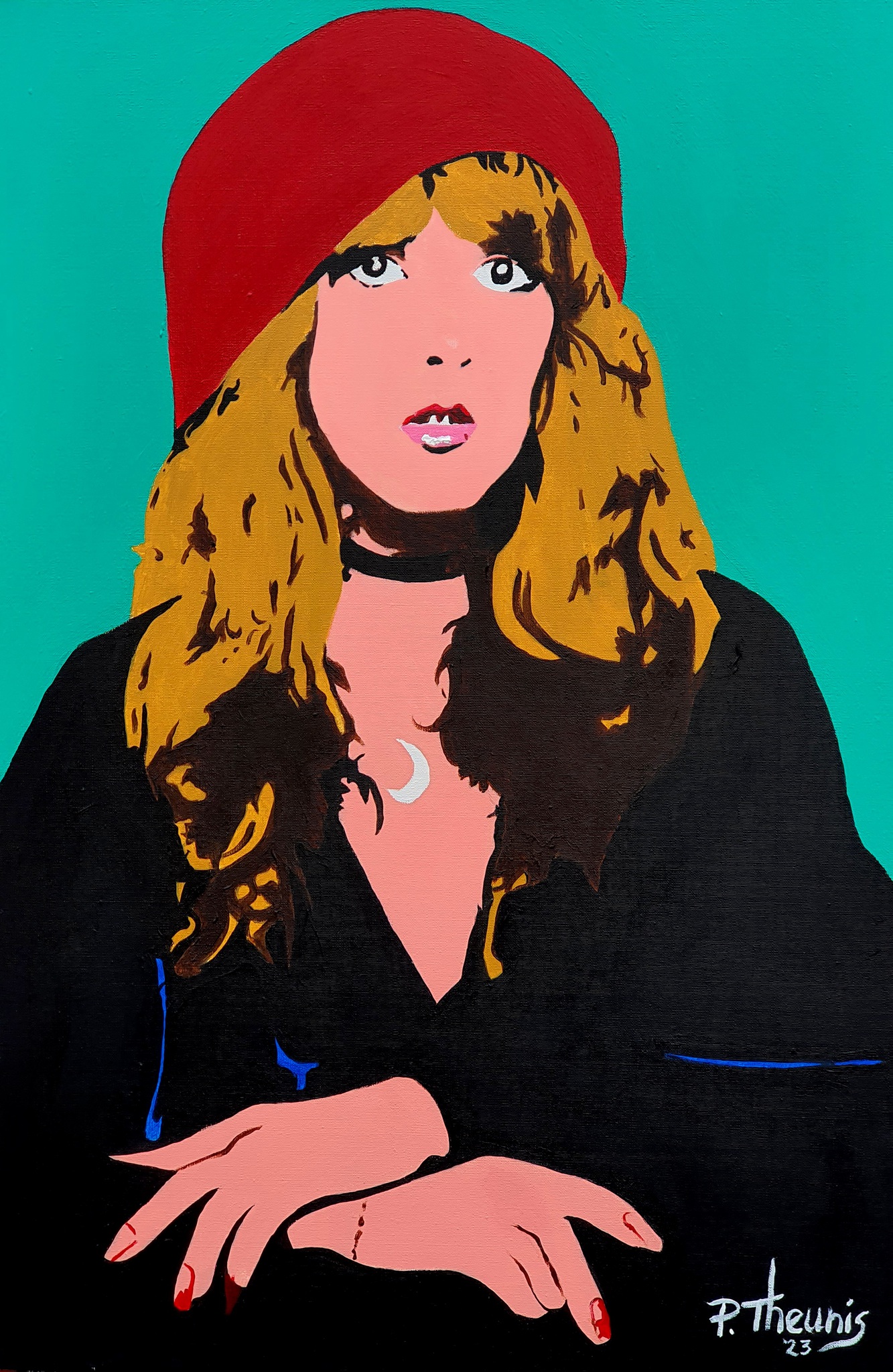 Een icoon waar we zeker aandacht moeten besteden is Stevie Nicks, met haar stem en persoonlijkheid, een boegbeeld van Fleetwood Mac. Hier afgebeeld als een soort Mona Lisa, geschilderd in acrylverf.